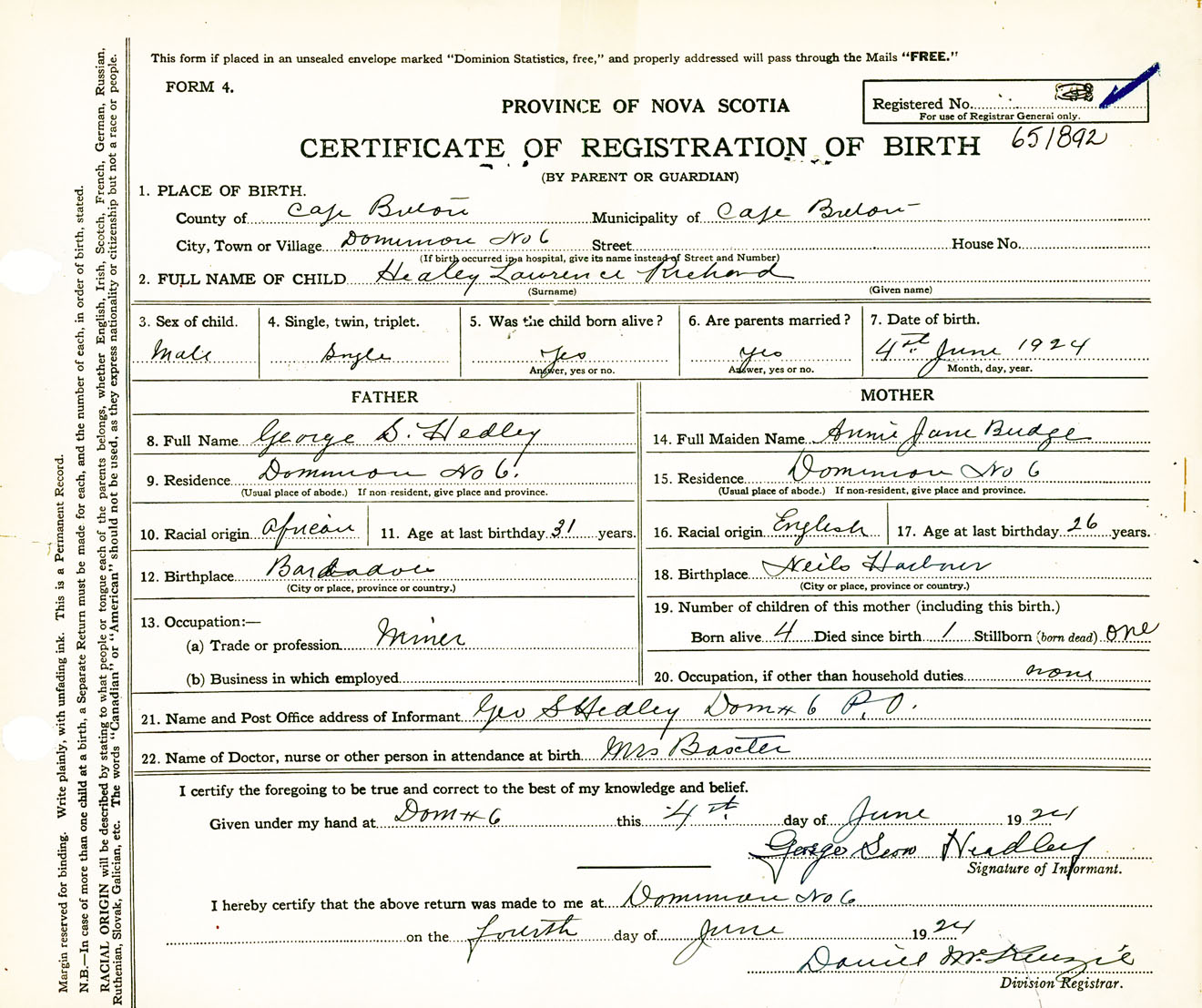 Male Birth Registration: Year: 1924 number: 65100892