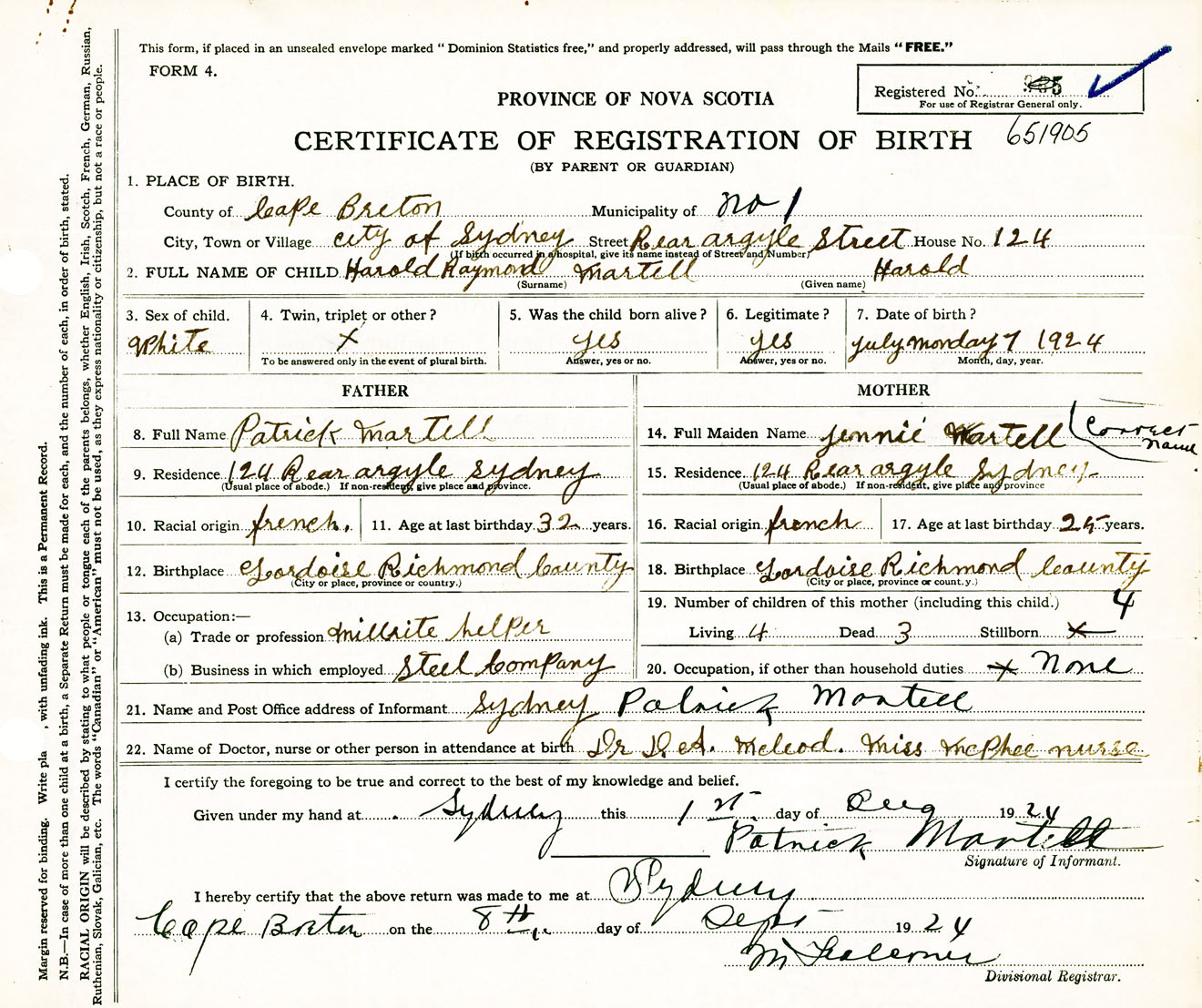 Male Birth Registration: Year: 1924 number: 65100905