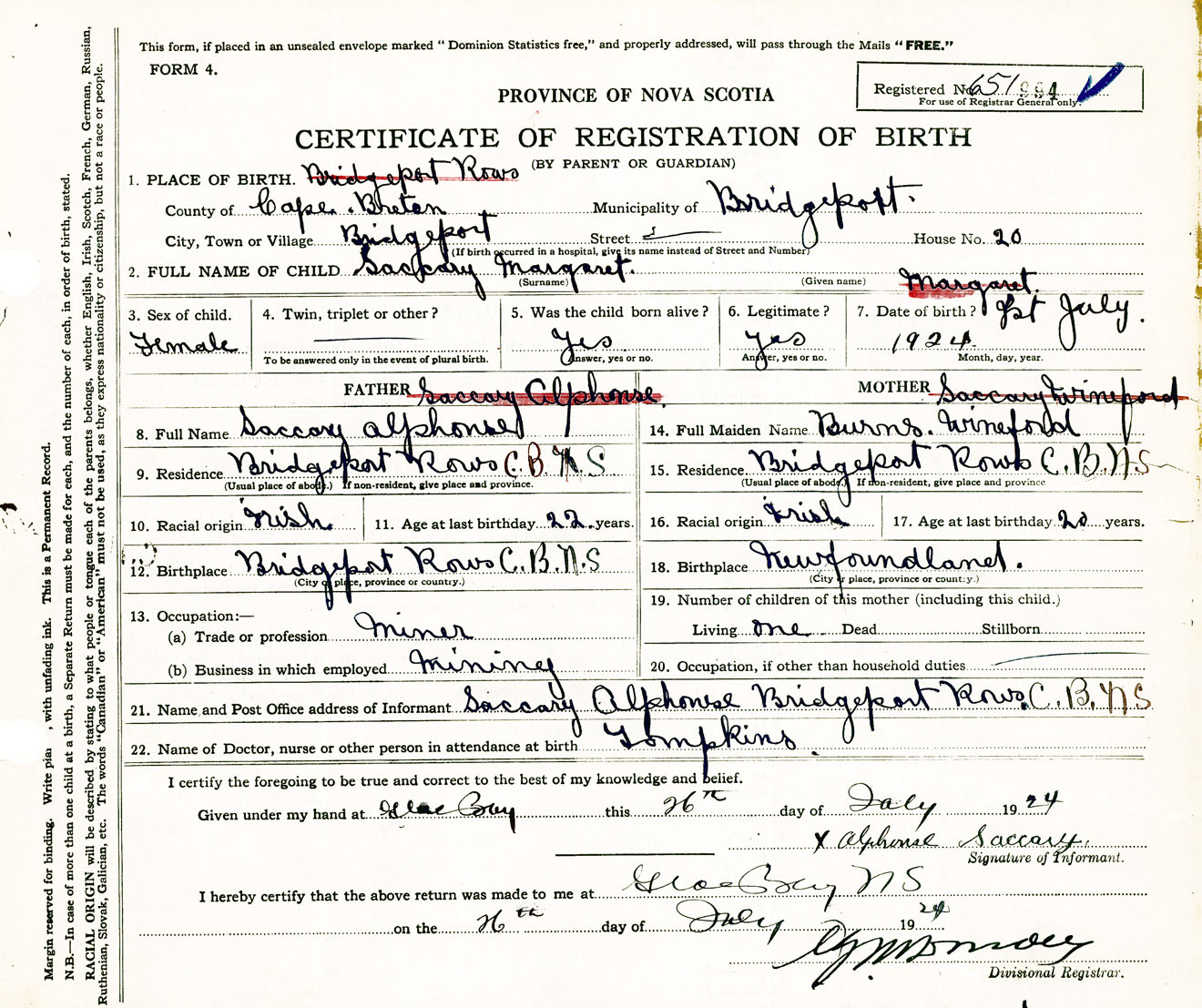 Female Birth Registration: Year: 1924 number: 65100994