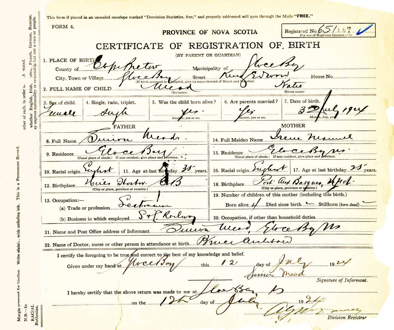 Female Birth Registration: Year: 1924 number: 65100997