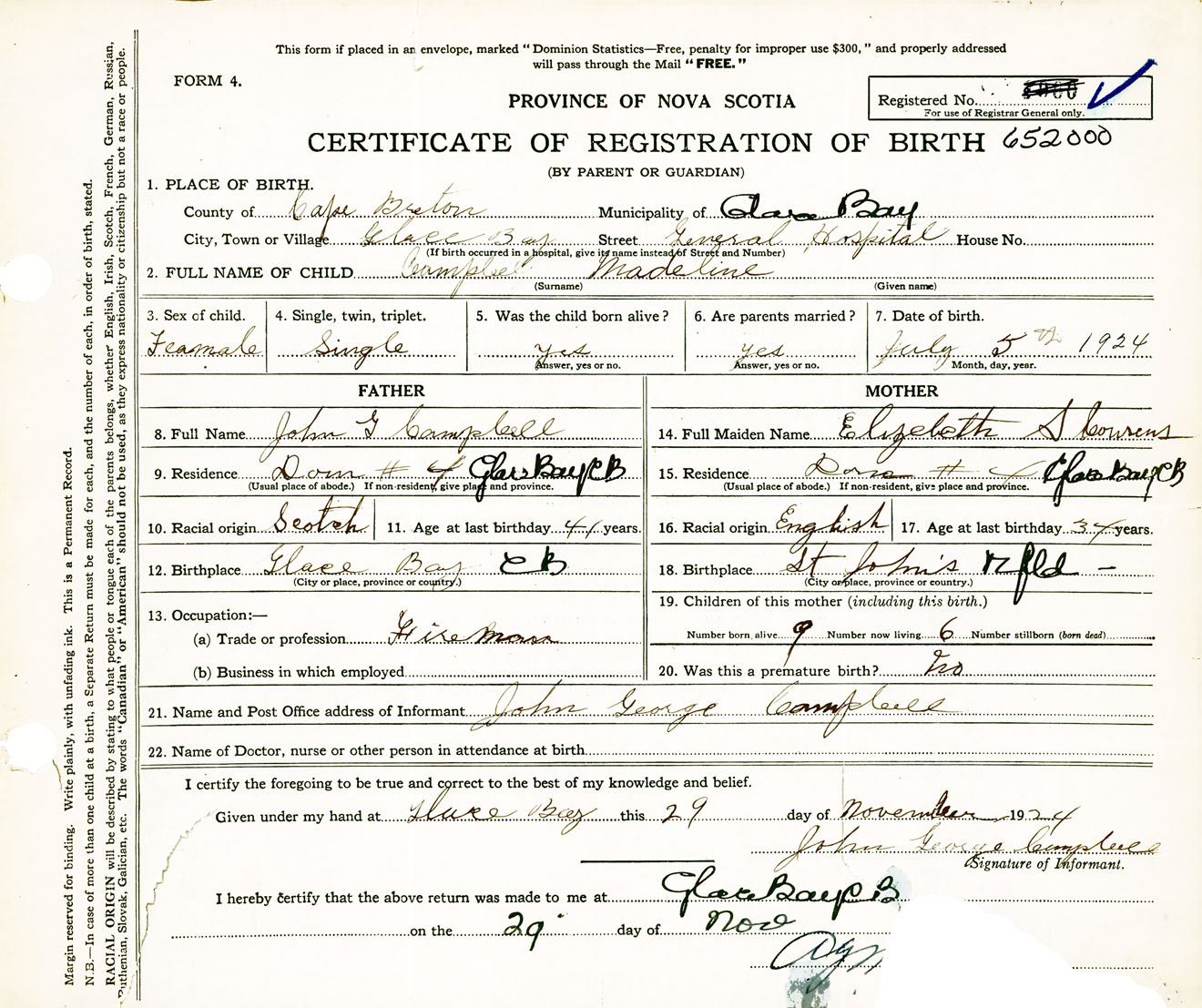 Female Birth Registration: Year: 1924 number: 65200000