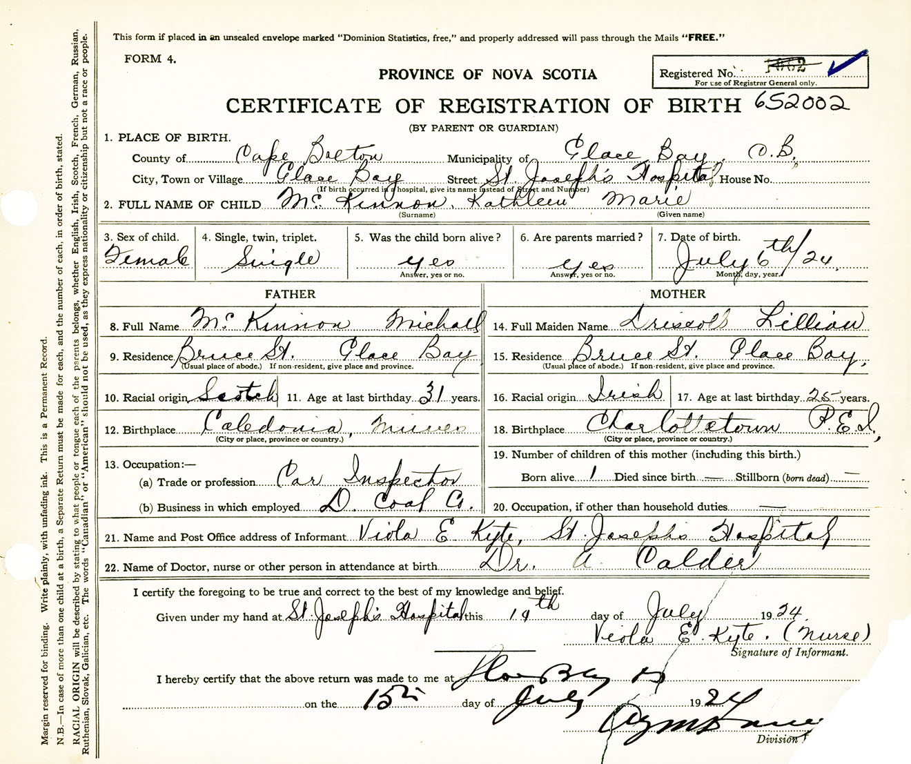 Female Birth Registration: Year: 1924 number: 65200002