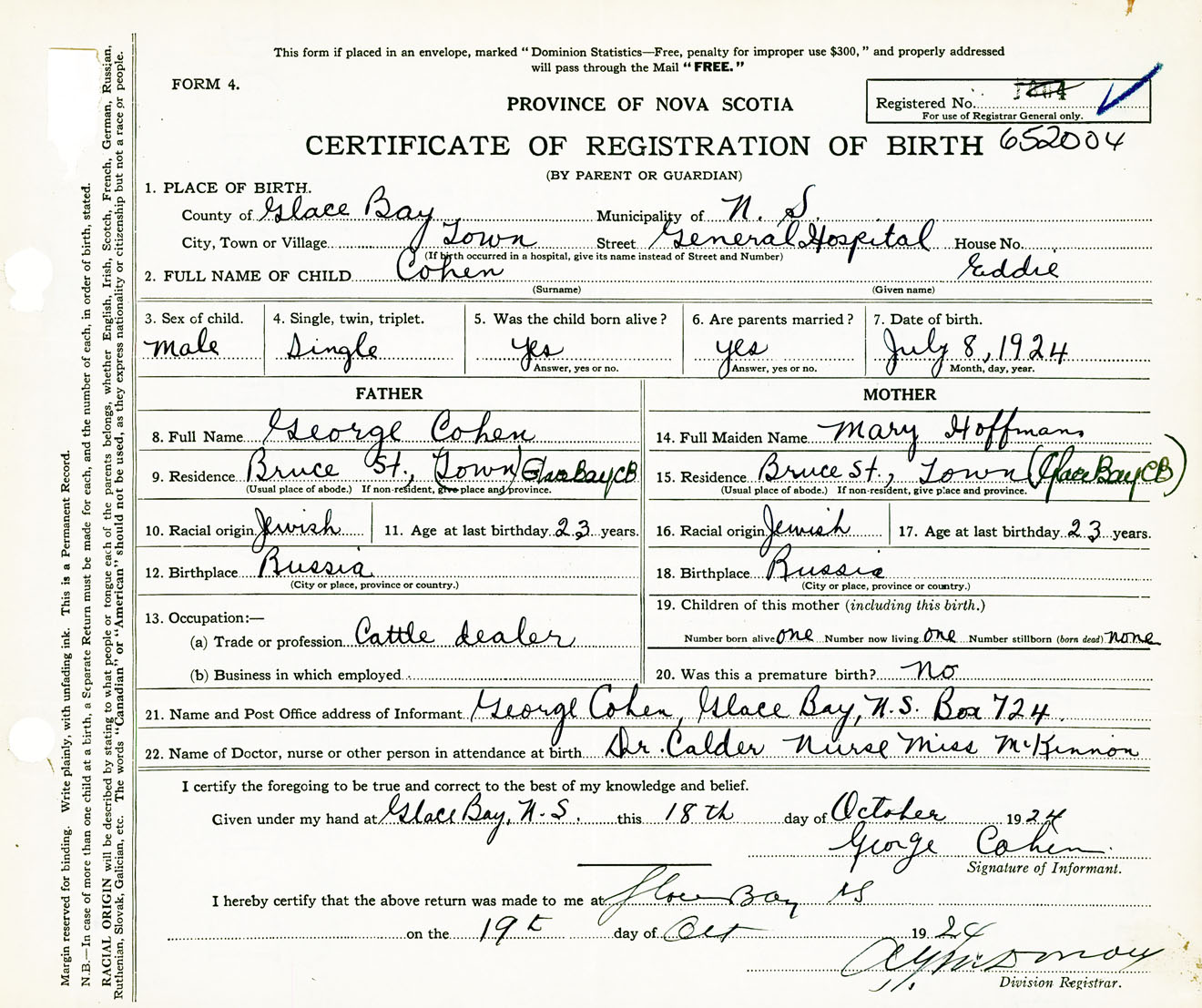 Male Birth Registration: Year: 1924 number: 65200004