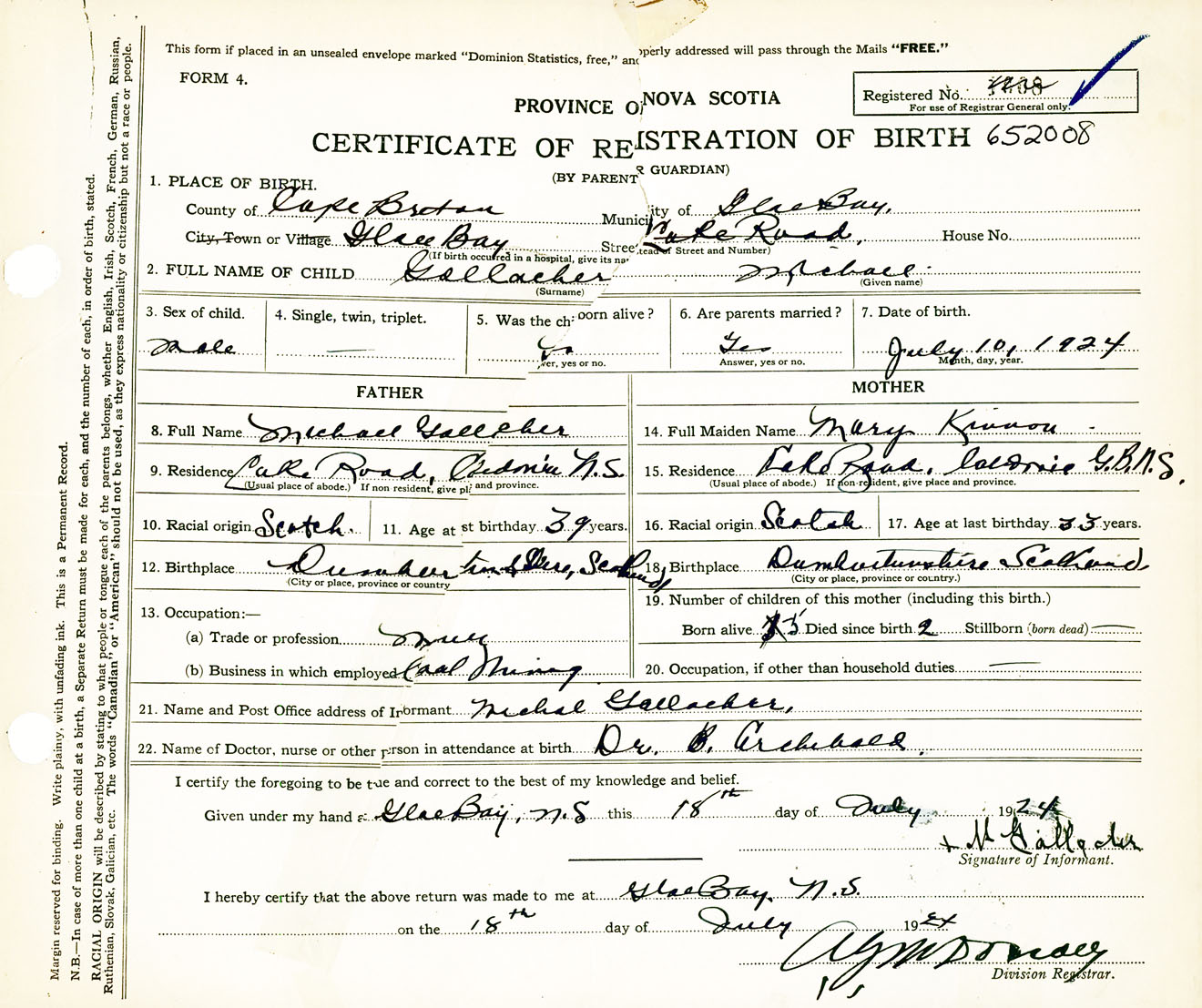 Male Birth Registration: Year: 1924 number: 65200008