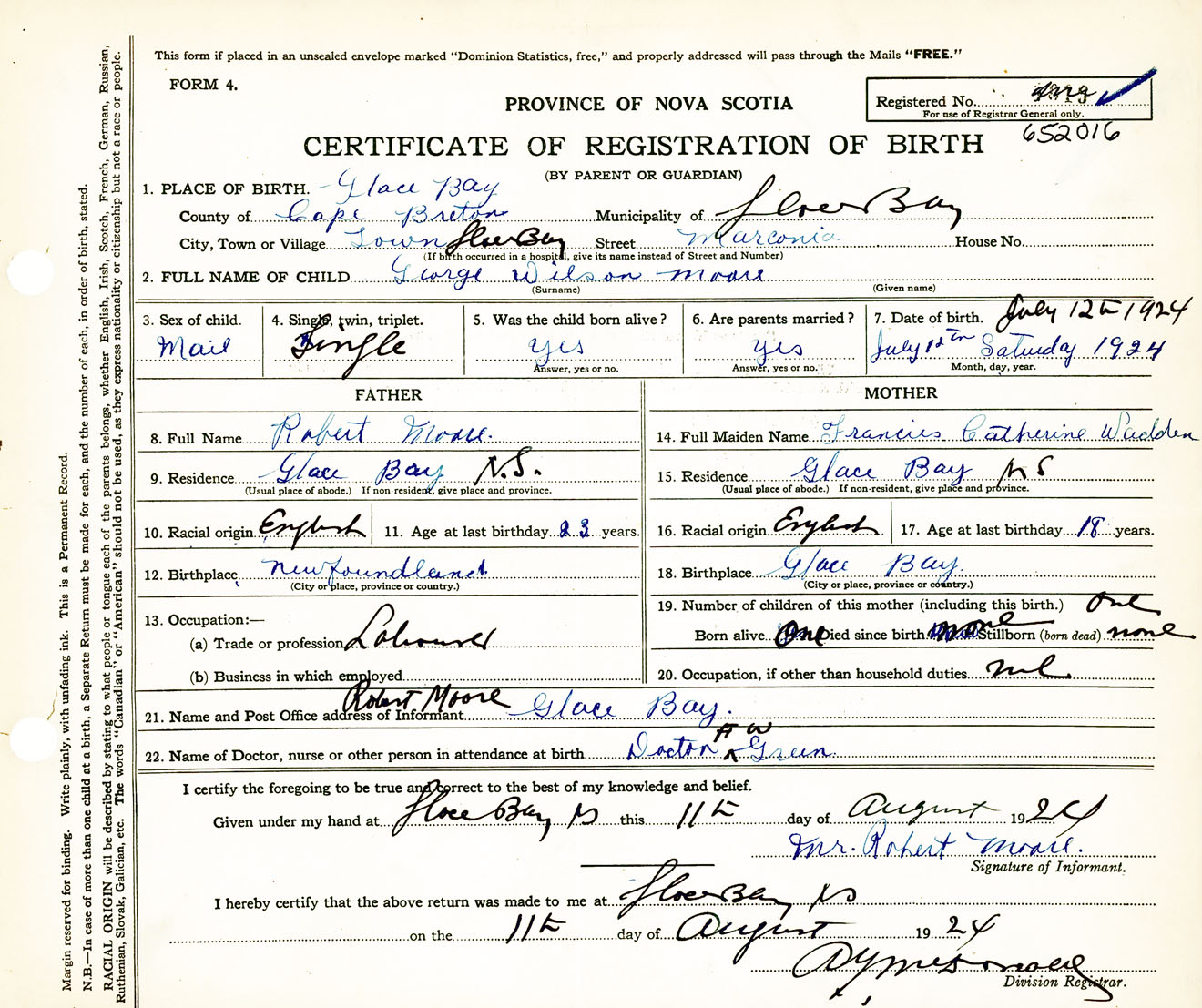 Male Birth Registration: Year: 1924 number: 65200016