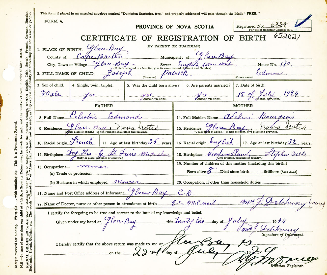 Male Birth Registration: Year: 1924 number: 65200021