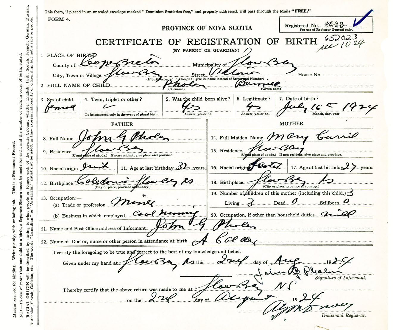 Female Birth Registration: Year: 1924 number: 65200023
