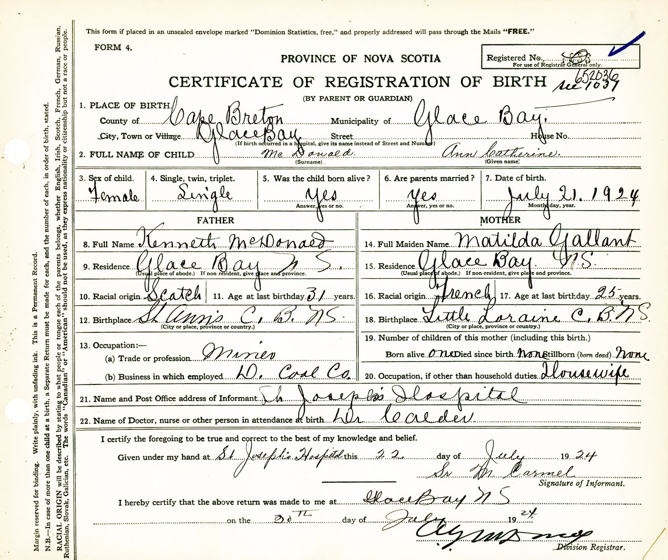 Female Birth Registration: Year: 1924 number: 65200036