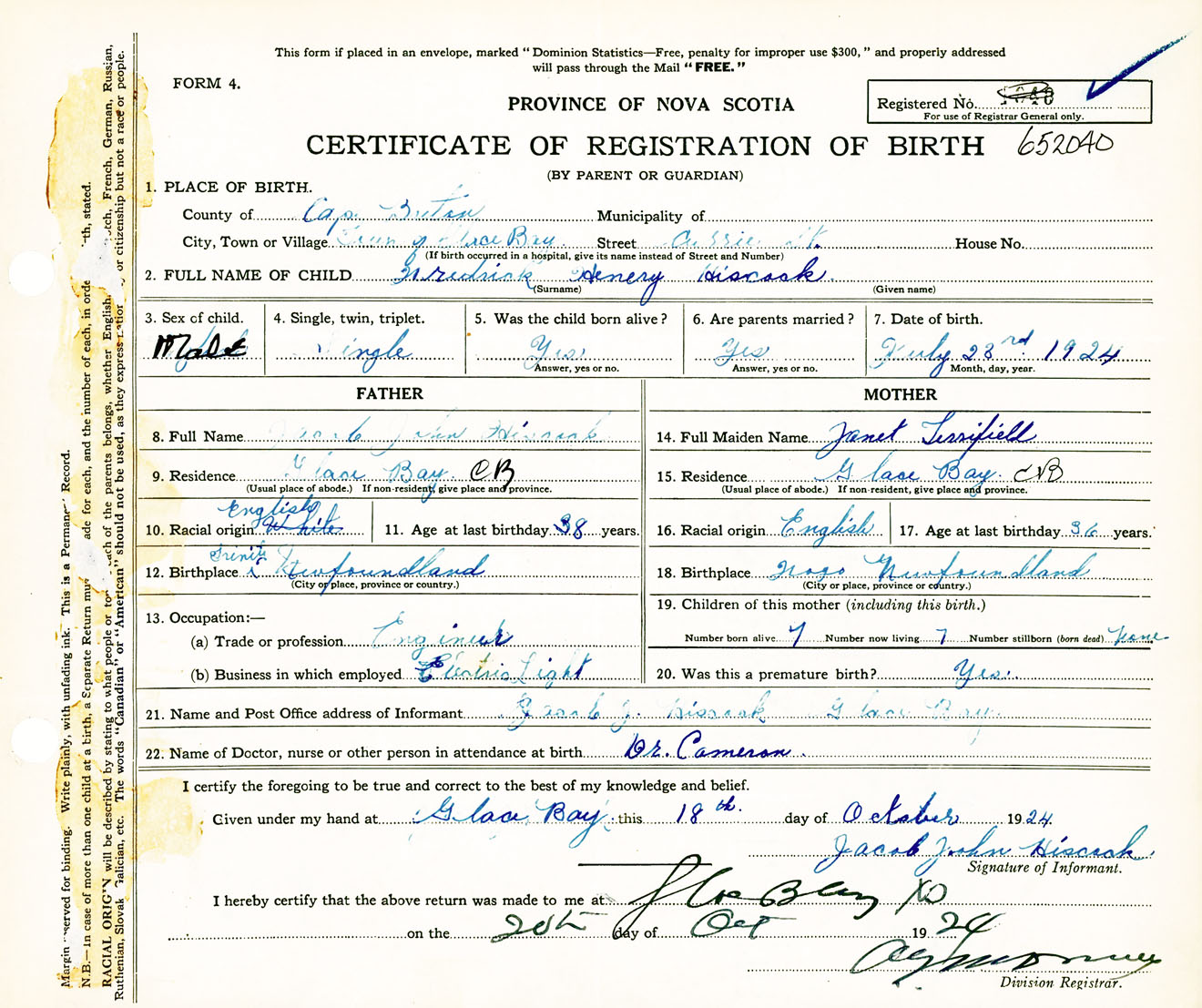 Male Birth Registration: Year: 1924 number: 65200040