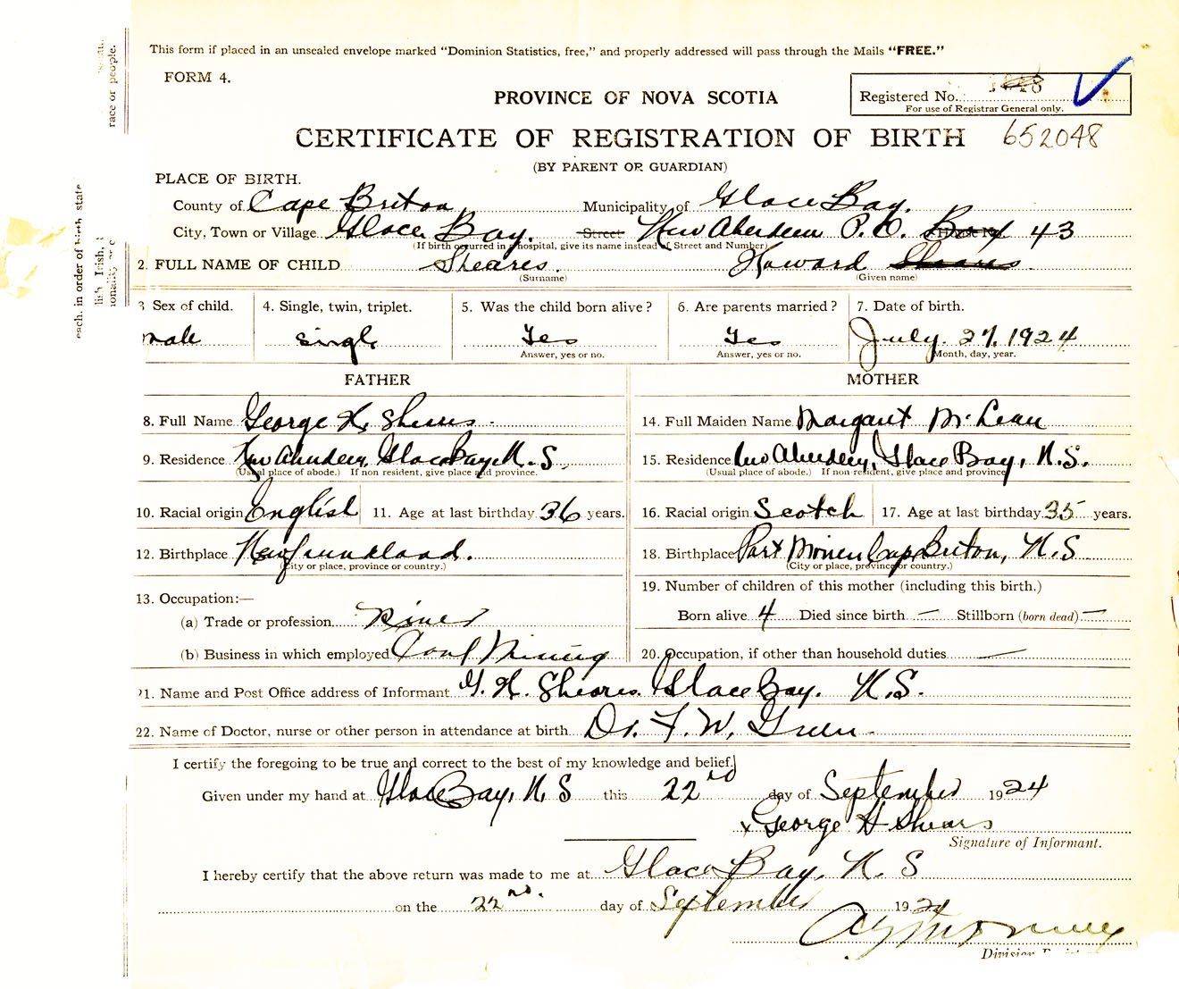 Male Birth Registration: Year: 1924 number: 65200048