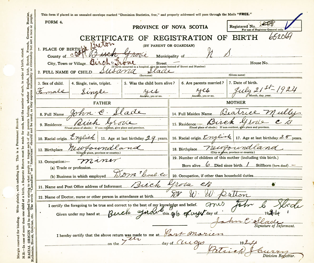 Female Birth Registration: Year: 1924 number: 65200069