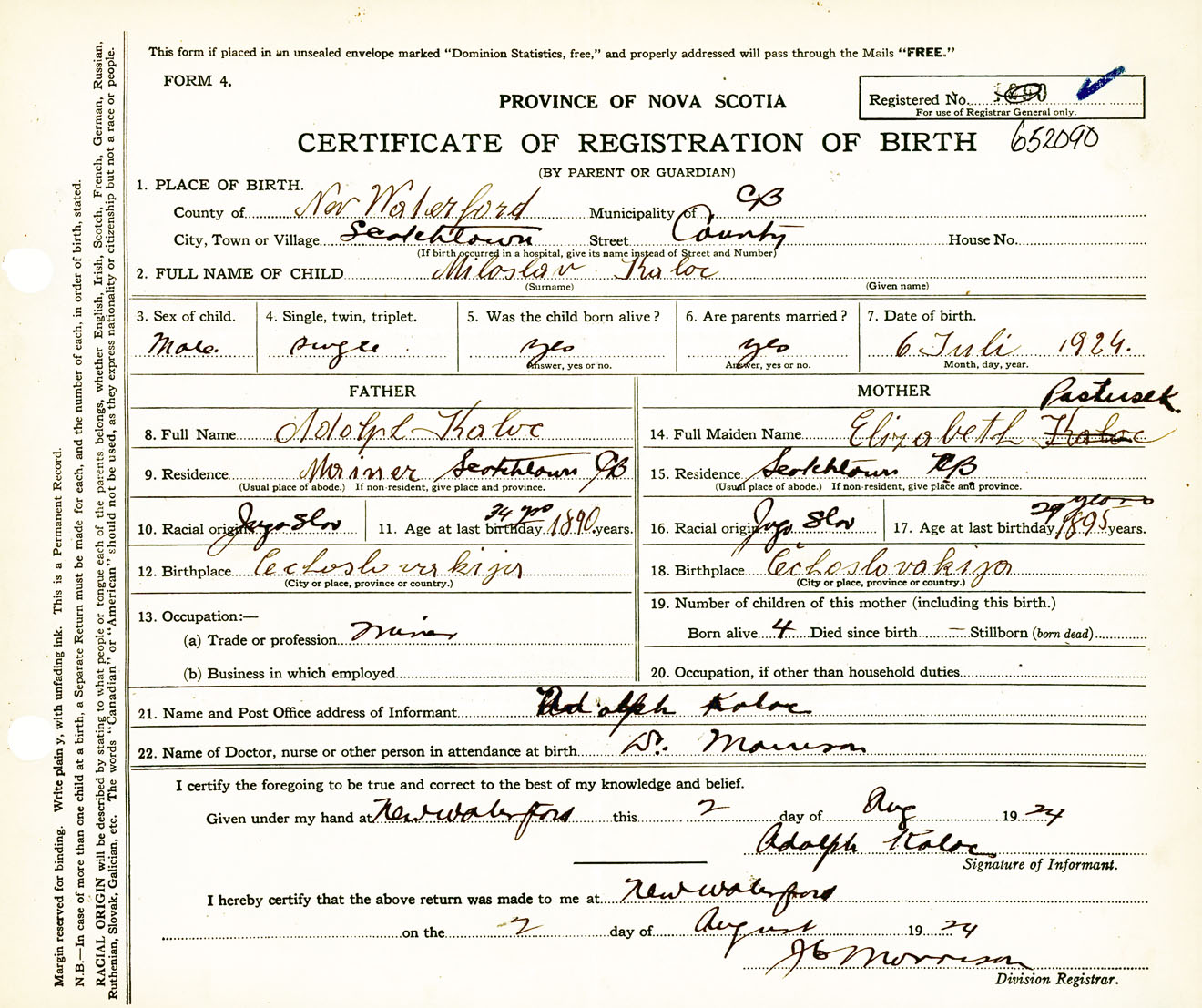 Male Birth Registration: Year: 1924 number: 65200090