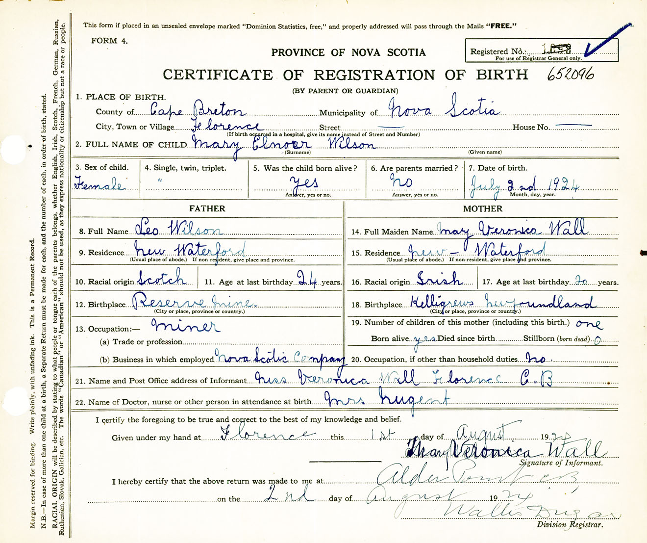 Female Birth Registration: Year: 1924 number: 65200096