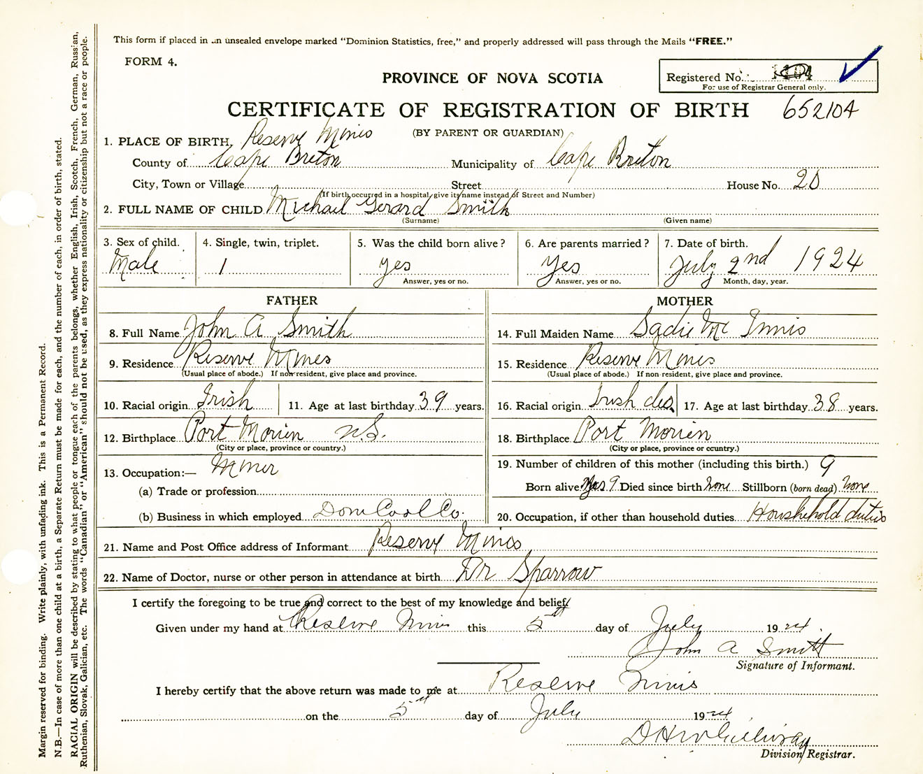 Male Birth Registration: Year: 1924 number: 65200104