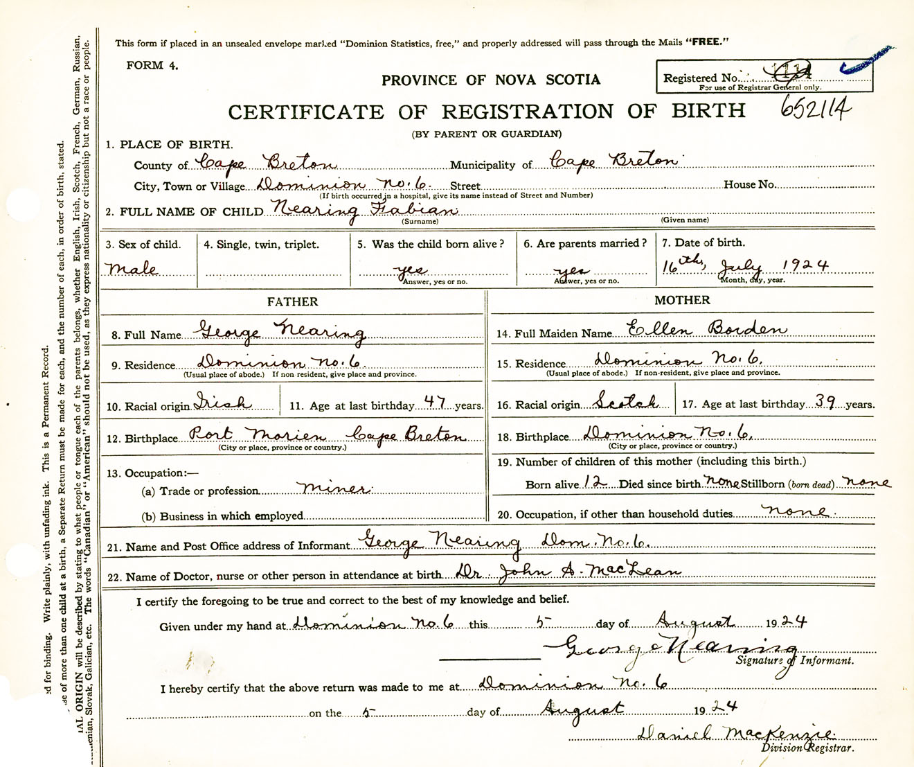 Male Birth Registration: Year: 1924 number: 65200114