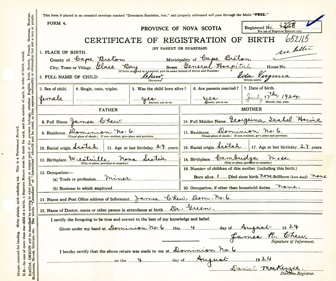Female Birth Registration: Year: 1924 number: 65200115