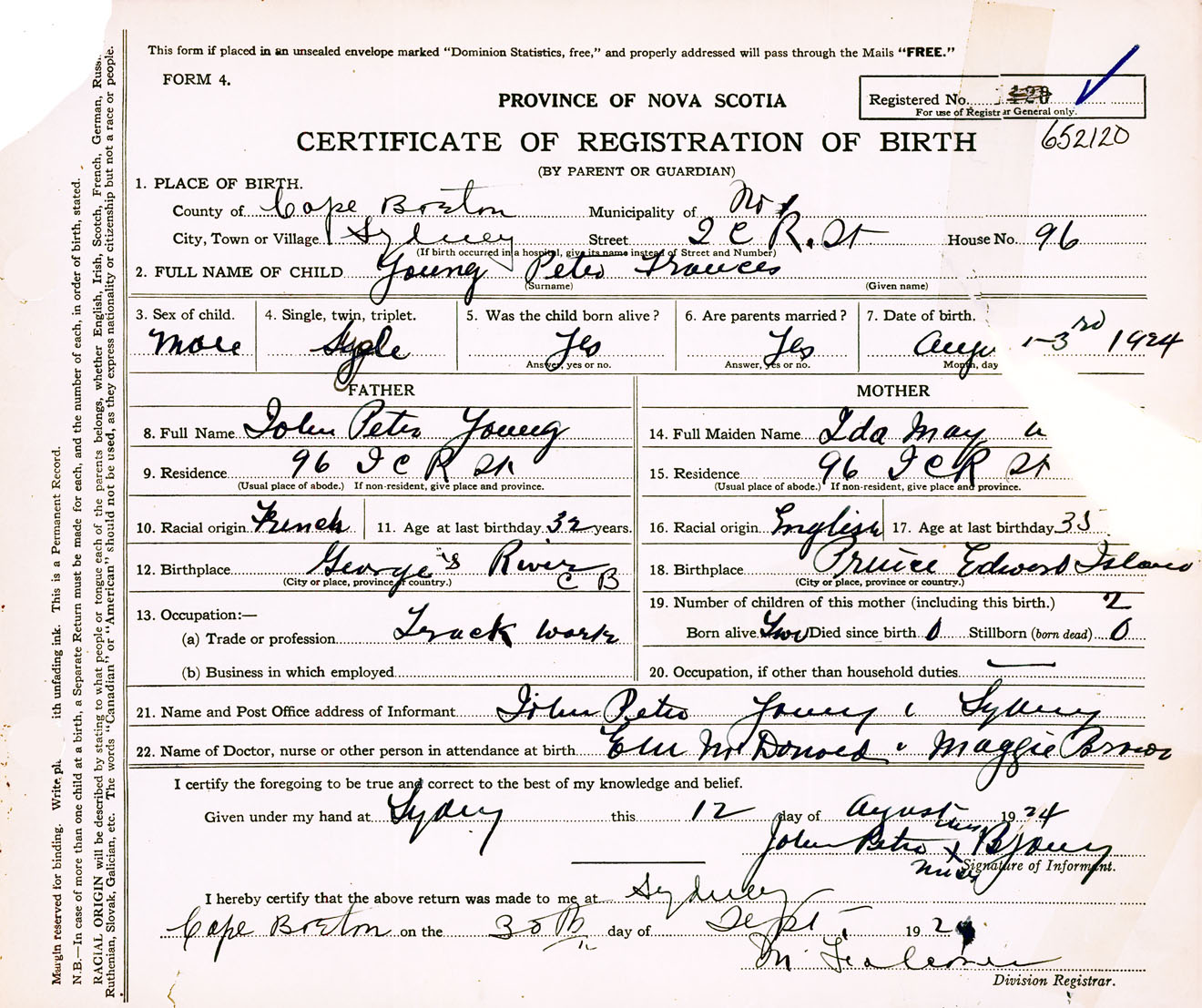 Male Birth Registration: Year: 1924 number: 65200120