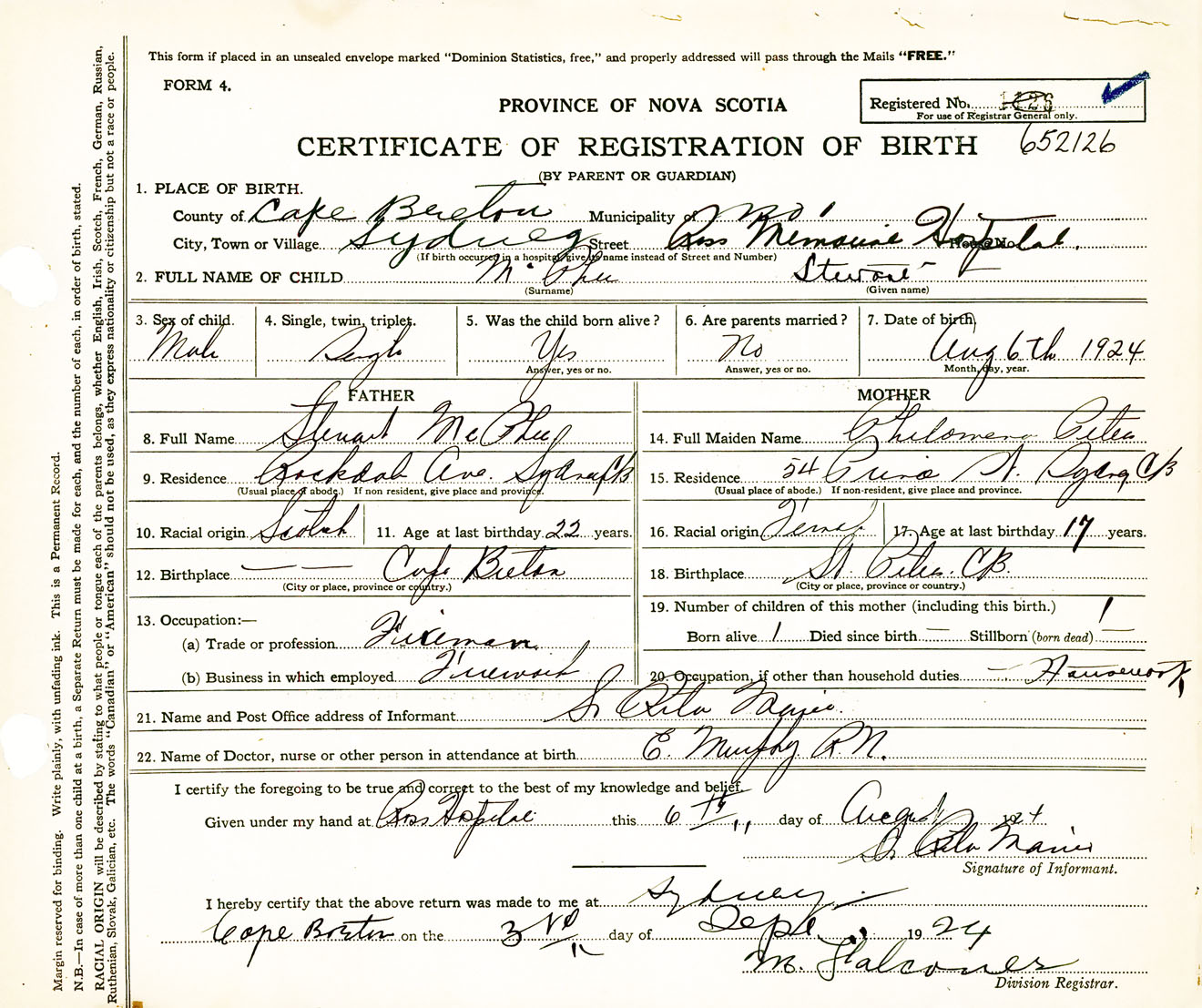 Male Birth Registration: Year: 1924 number: 65200126