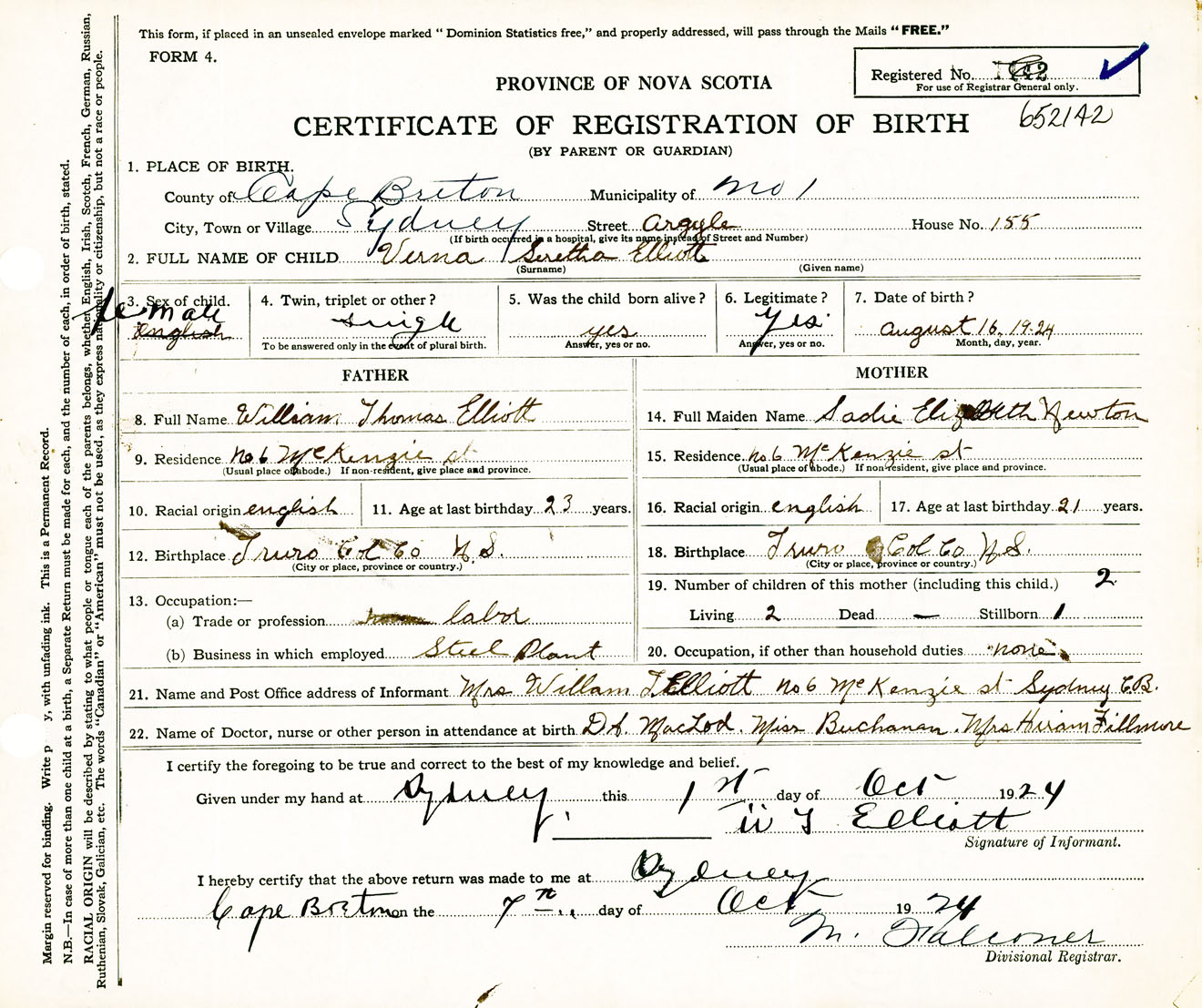 Female Birth Registration: Year: 1924 number: 65200142