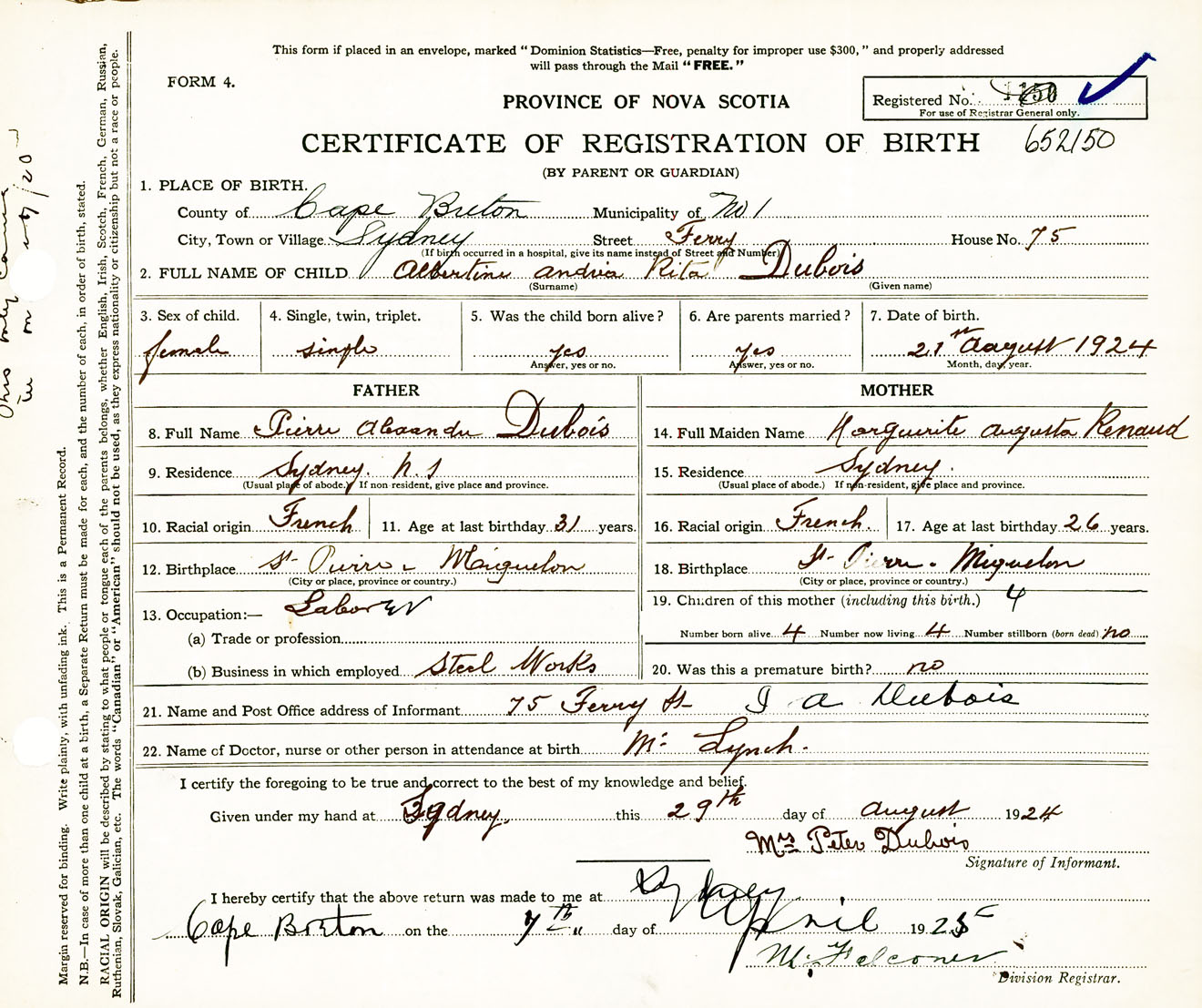 Female Birth Registration: Year: 1924 number: 65200150