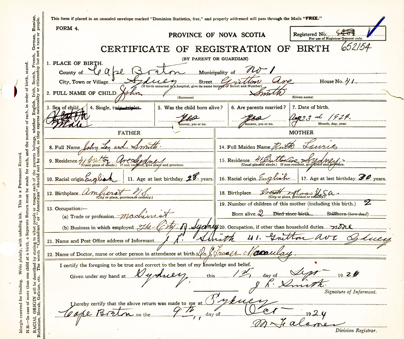 Male Birth Registration: Year: 1924 number: 65200154