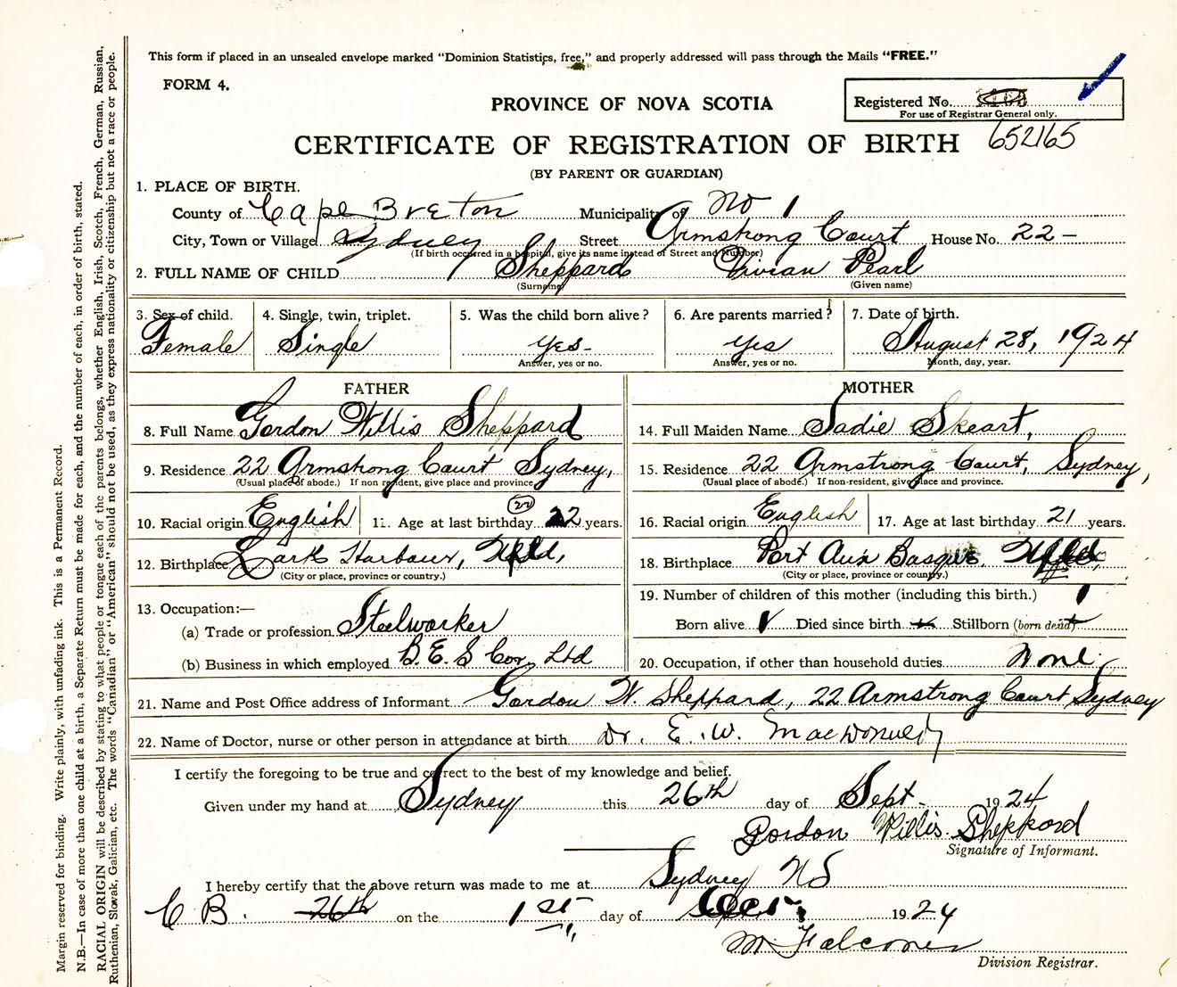 Female Birth Registration: Year: 1924 number: 65200165