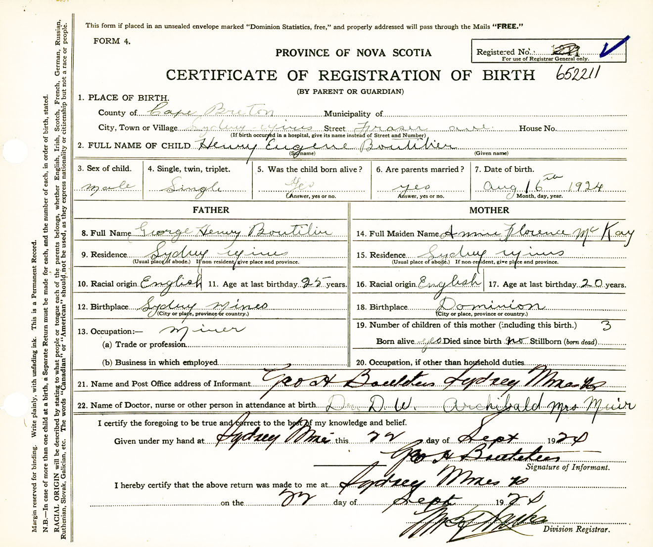 Male Birth Registration: Year: 1924 number: 65200211