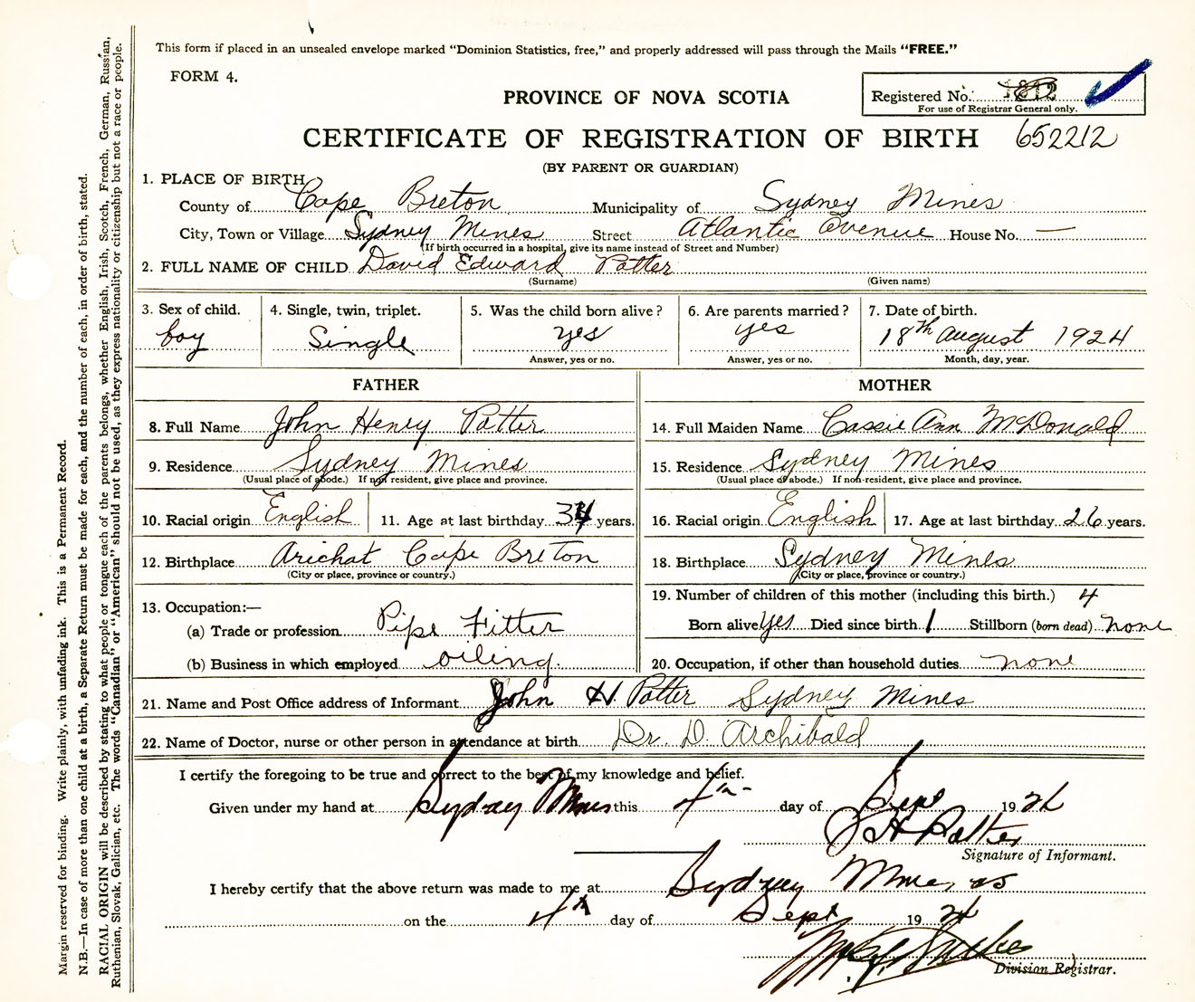Male Birth Registration: Year: 1924 number: 65200212