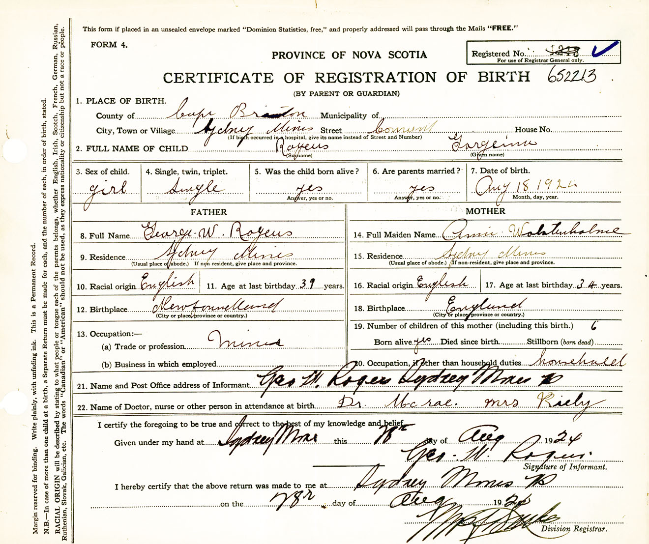 Female Birth Registration: Year: 1924 number: 65200213