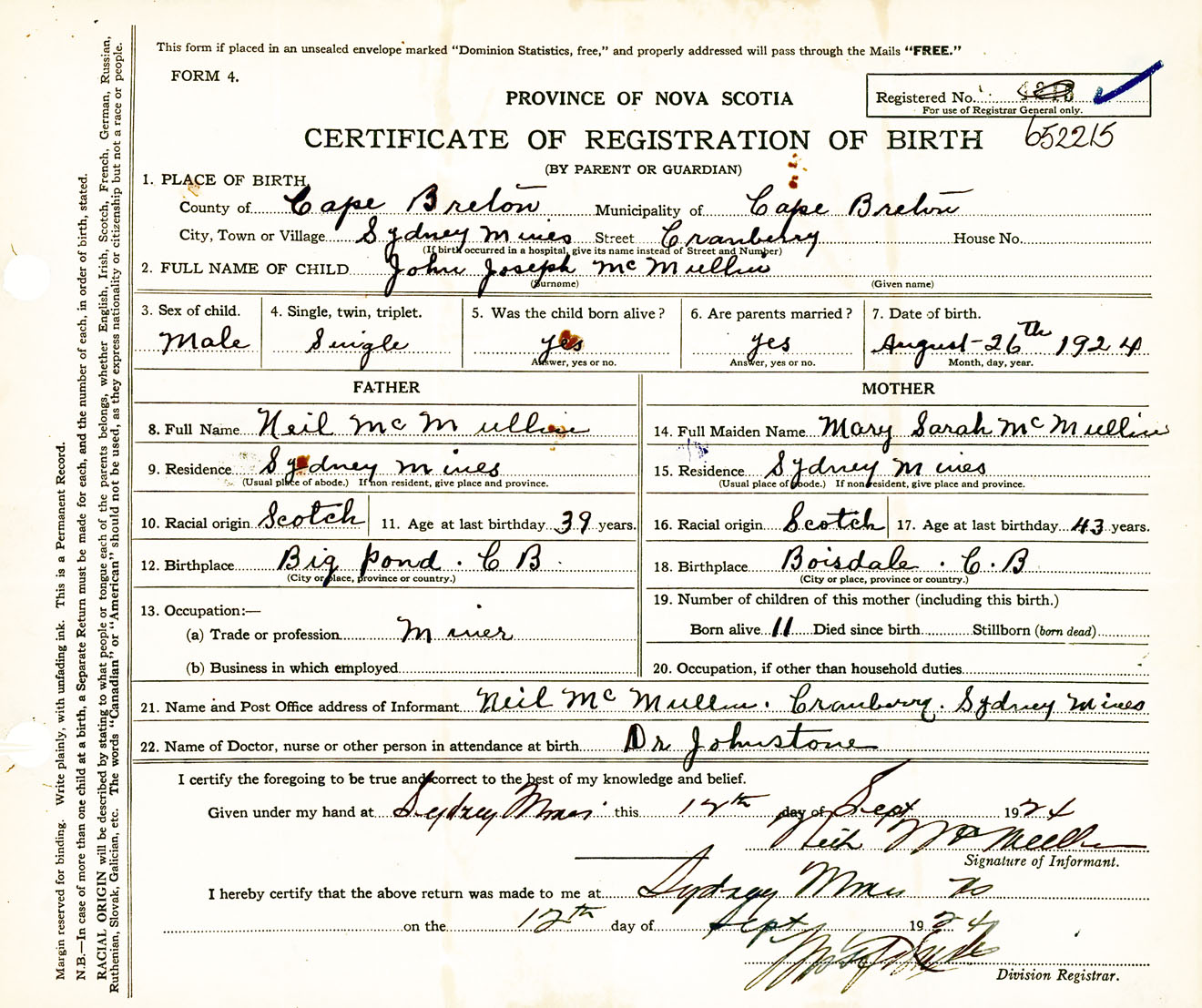 Male Birth Registration: Year: 1924 number: 65200215