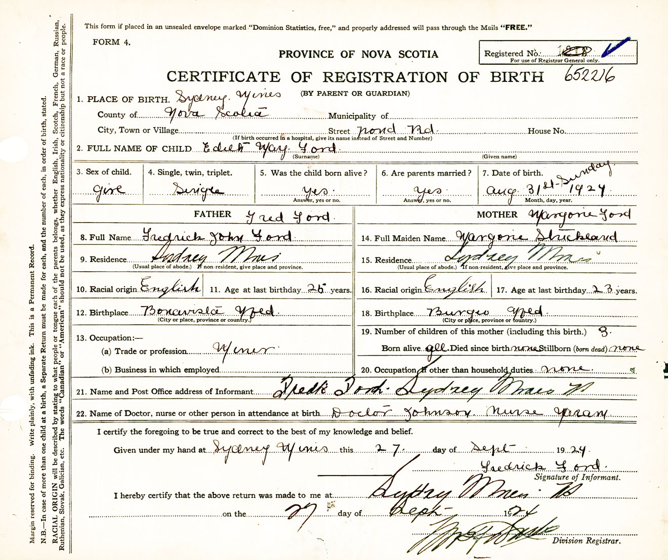 Female Birth Registration: Year: 1924 number: 65200216