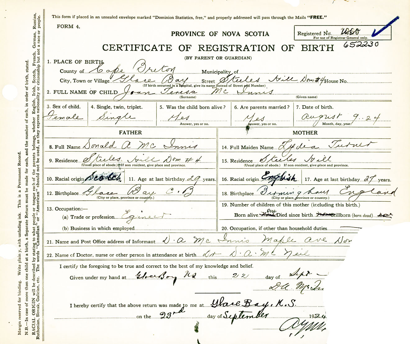 Female Birth Registration: Year: 1924 number: 65200230