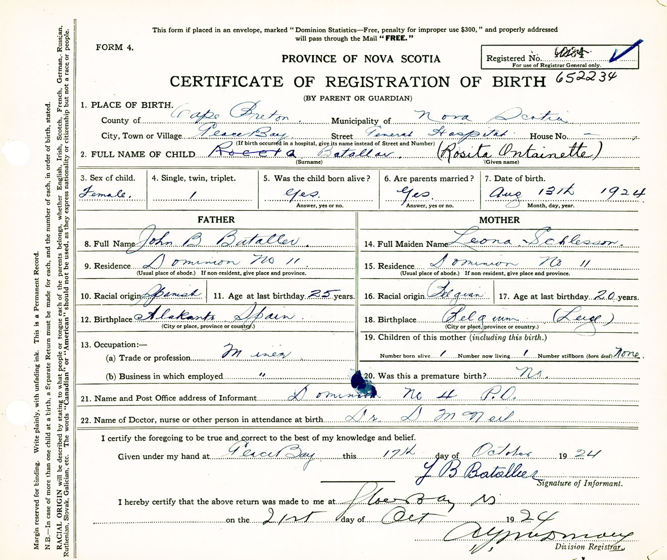 Female Birth Registration: Year: 1924 number: 65200234
