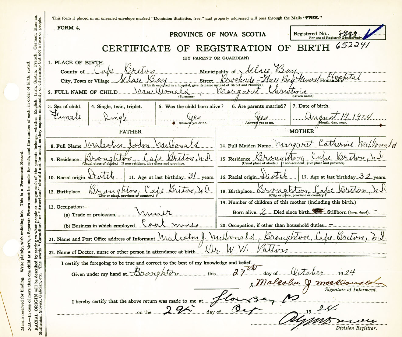 Female Birth Registration: Year: 1924 number: 65200241