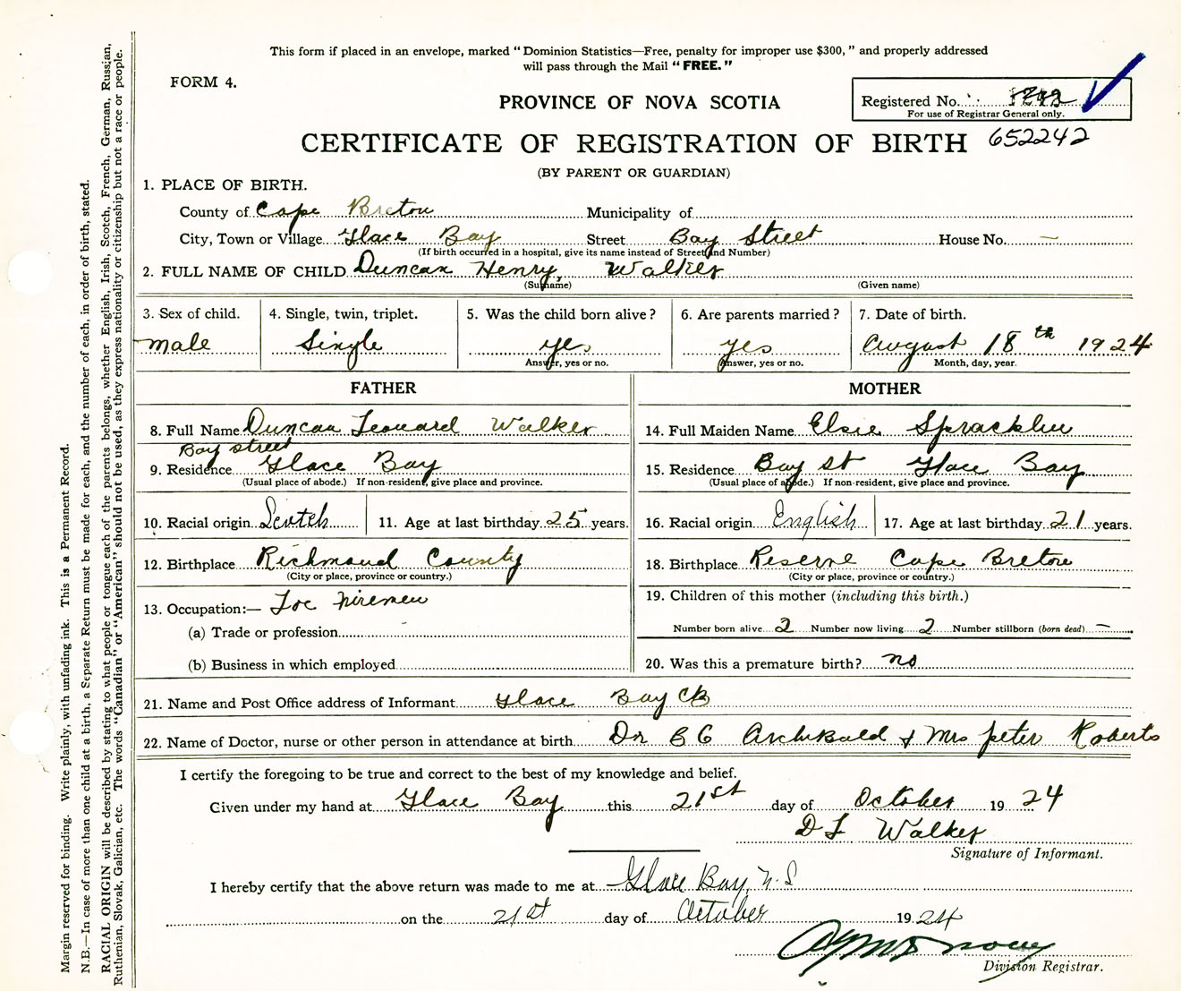 Male Birth Registration: Year: 1924 number: 65200242