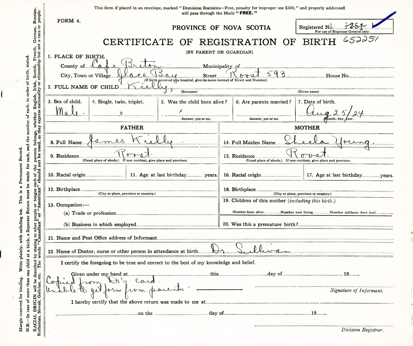 Male Birth Registration: Year: 1924 number: 65200251