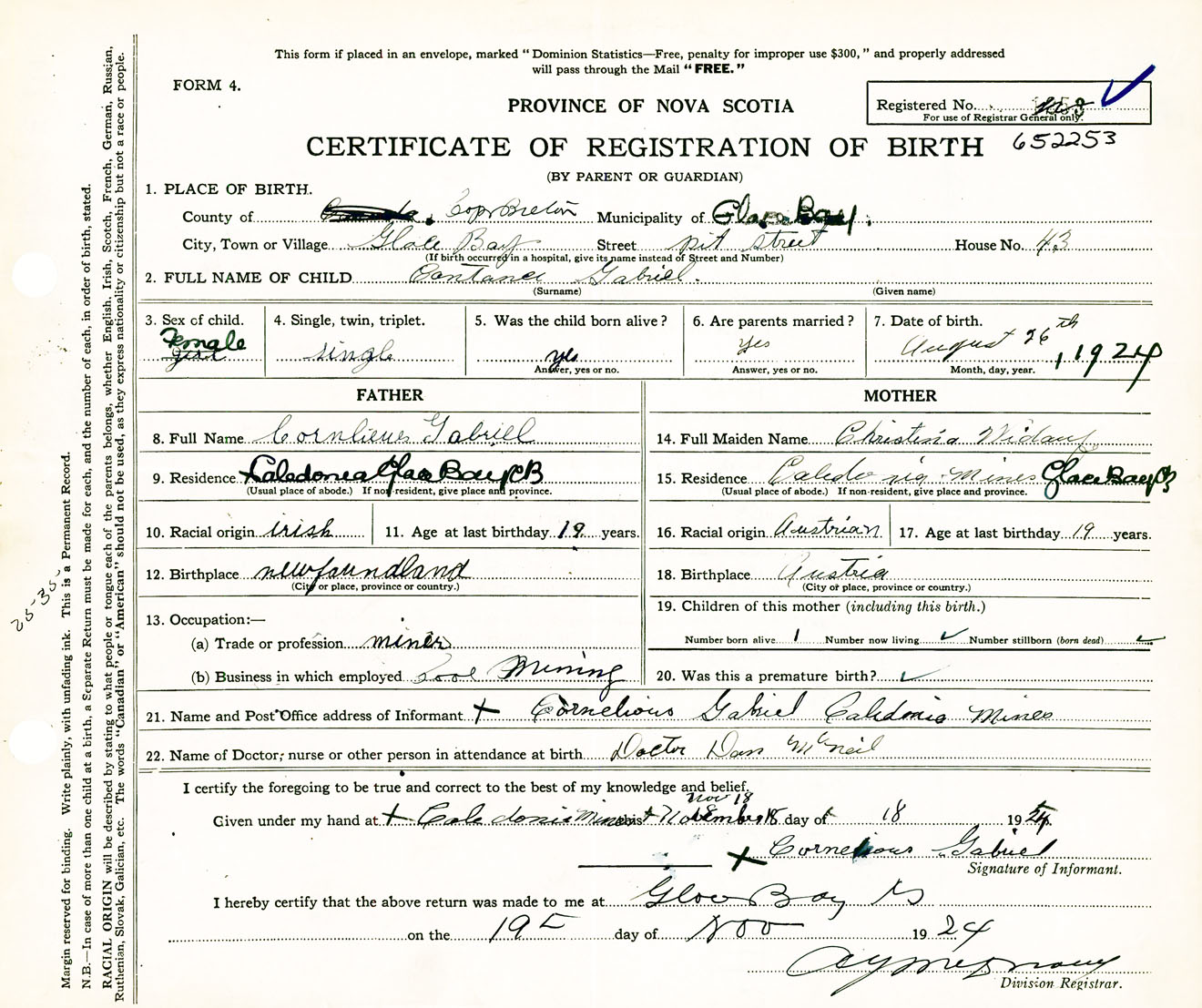 Female Birth Registration: Year: 1924 number: 65200253