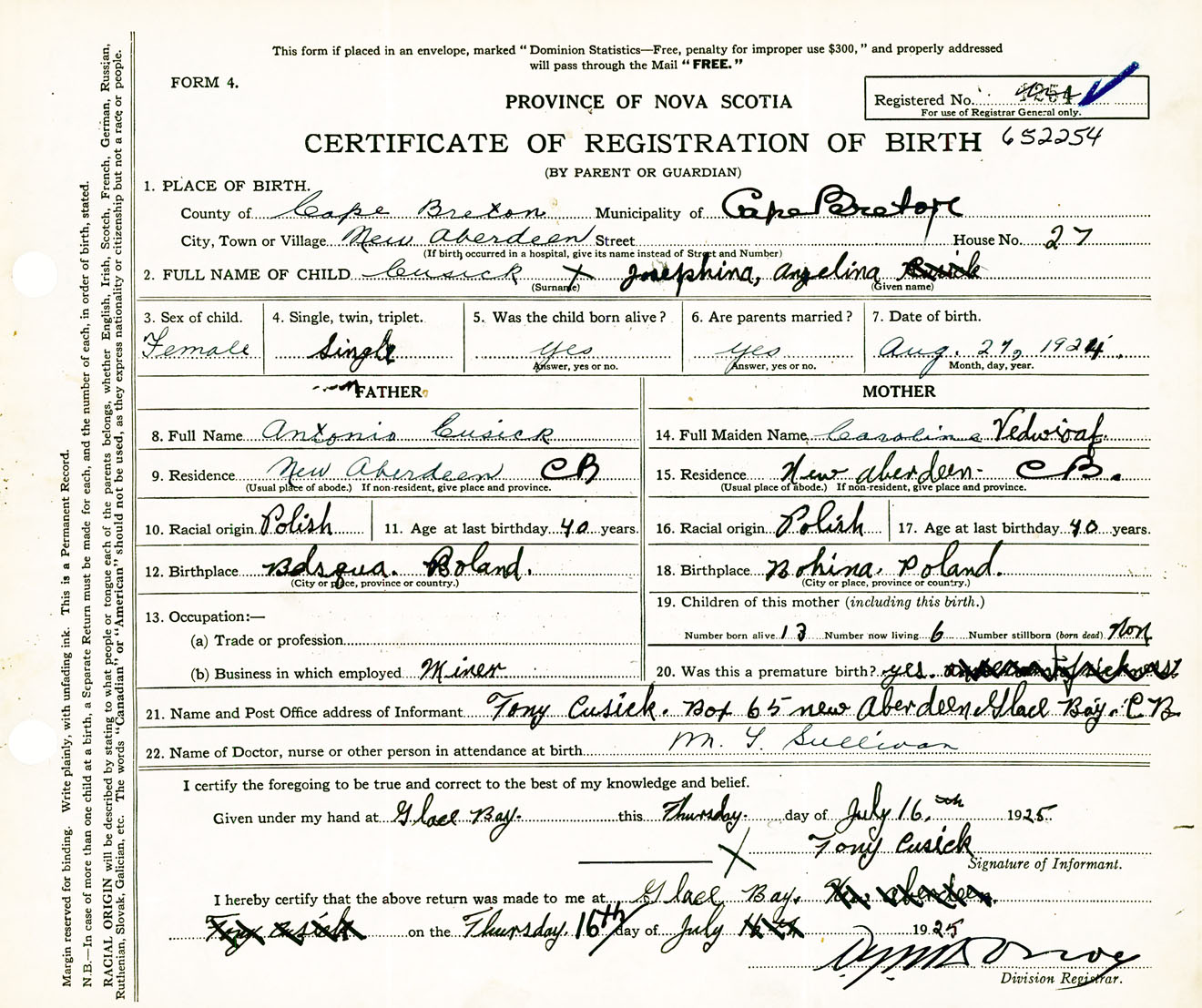 Female Birth Registration: Year: 1924 number: 65200254
