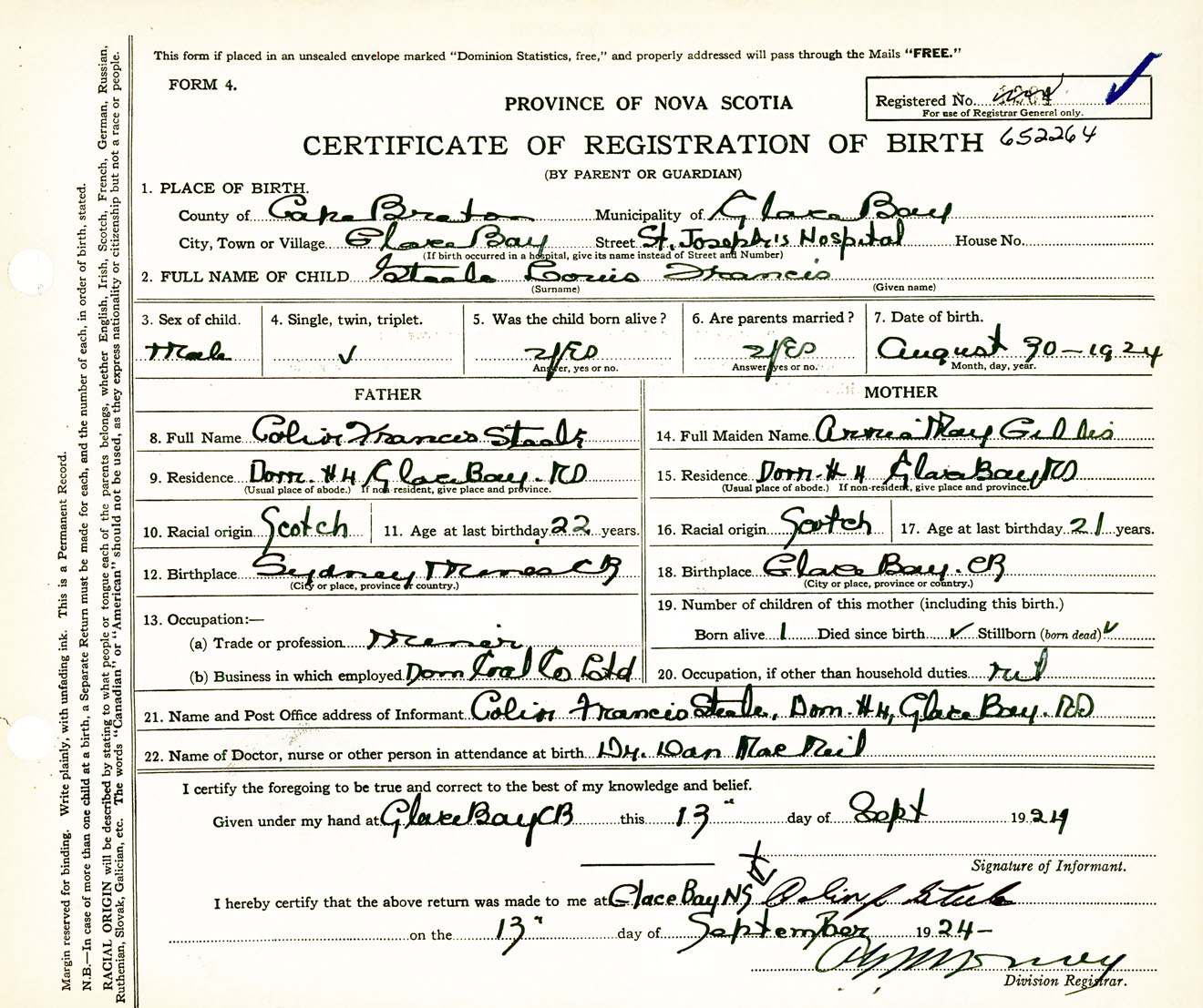 Male Birth Registration: Year: 1924 number: 65200264