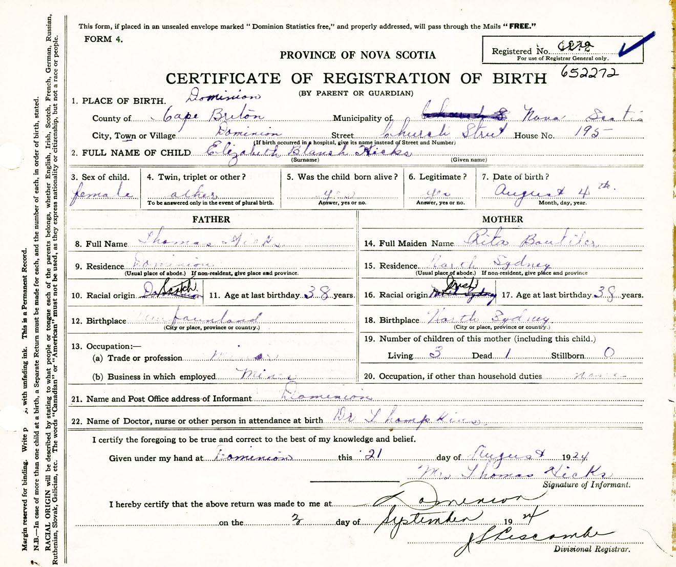 Female Birth Registration: Year: 1924 number: 65200272