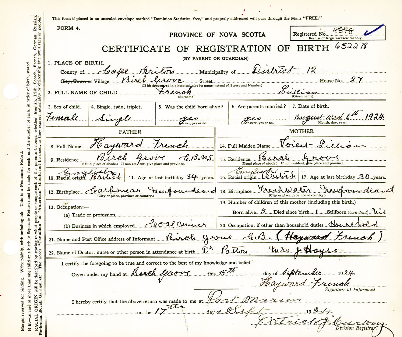 Female Birth Registration: Year: 1924 number: 65200278