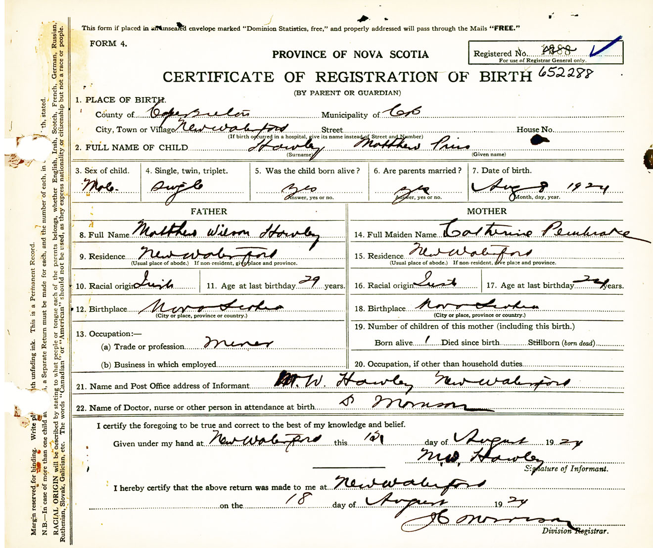 Male Birth Registration: Year: 1924 number: 65200288