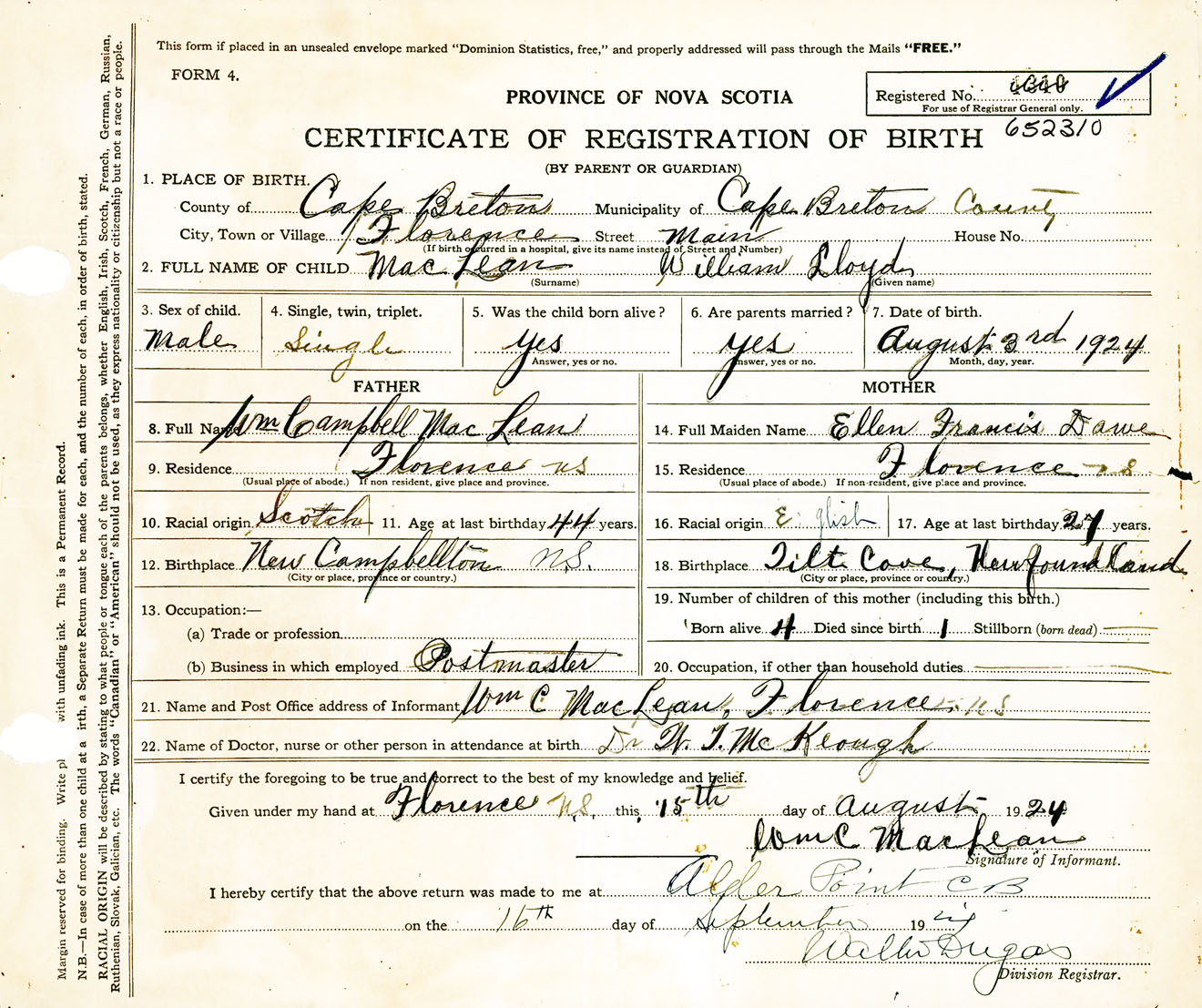 Male Birth Registration: Year: 1924 number: 65200310