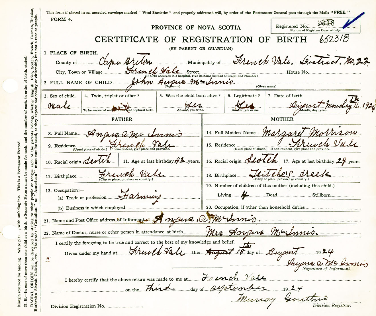 Male Birth Registration: Year: 1924 number: 65200318