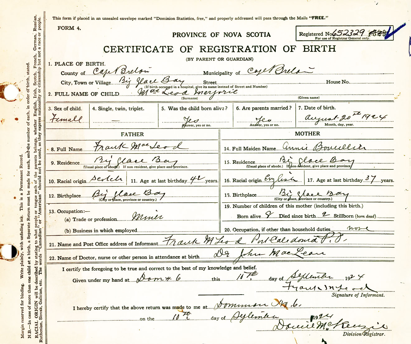 Female Birth Registration: Year: 1924 number: 65200329