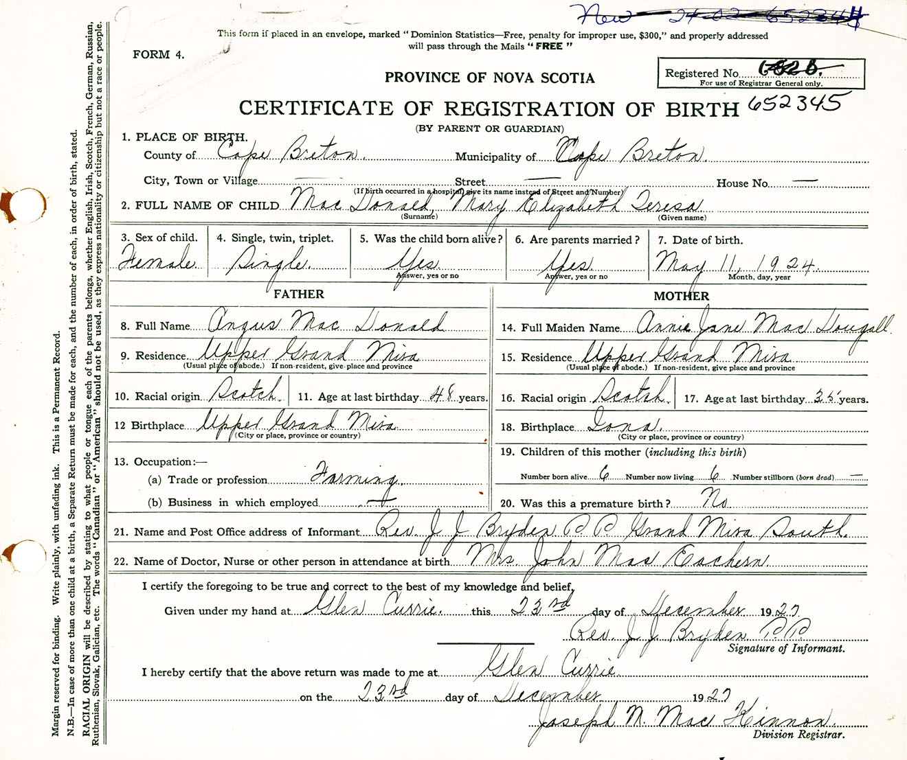 Female Birth Registration: Year: 1924 number: 65200345