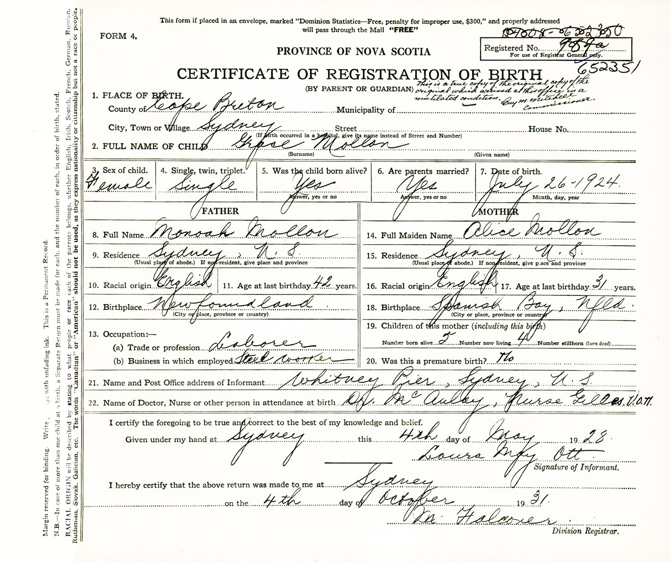 Female Birth Registration: Year: 1924 number: 65200351