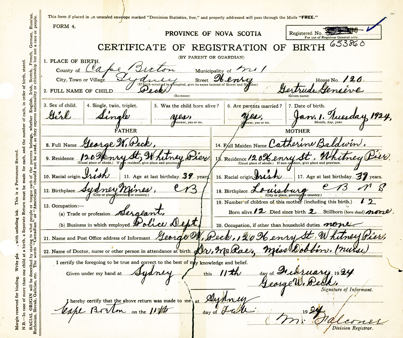 Female Birth Registration: Year: 1924 number: 65300860