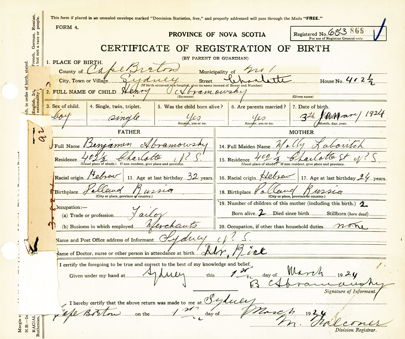 Male Birth Registration: Year: 1924 number: 65300866