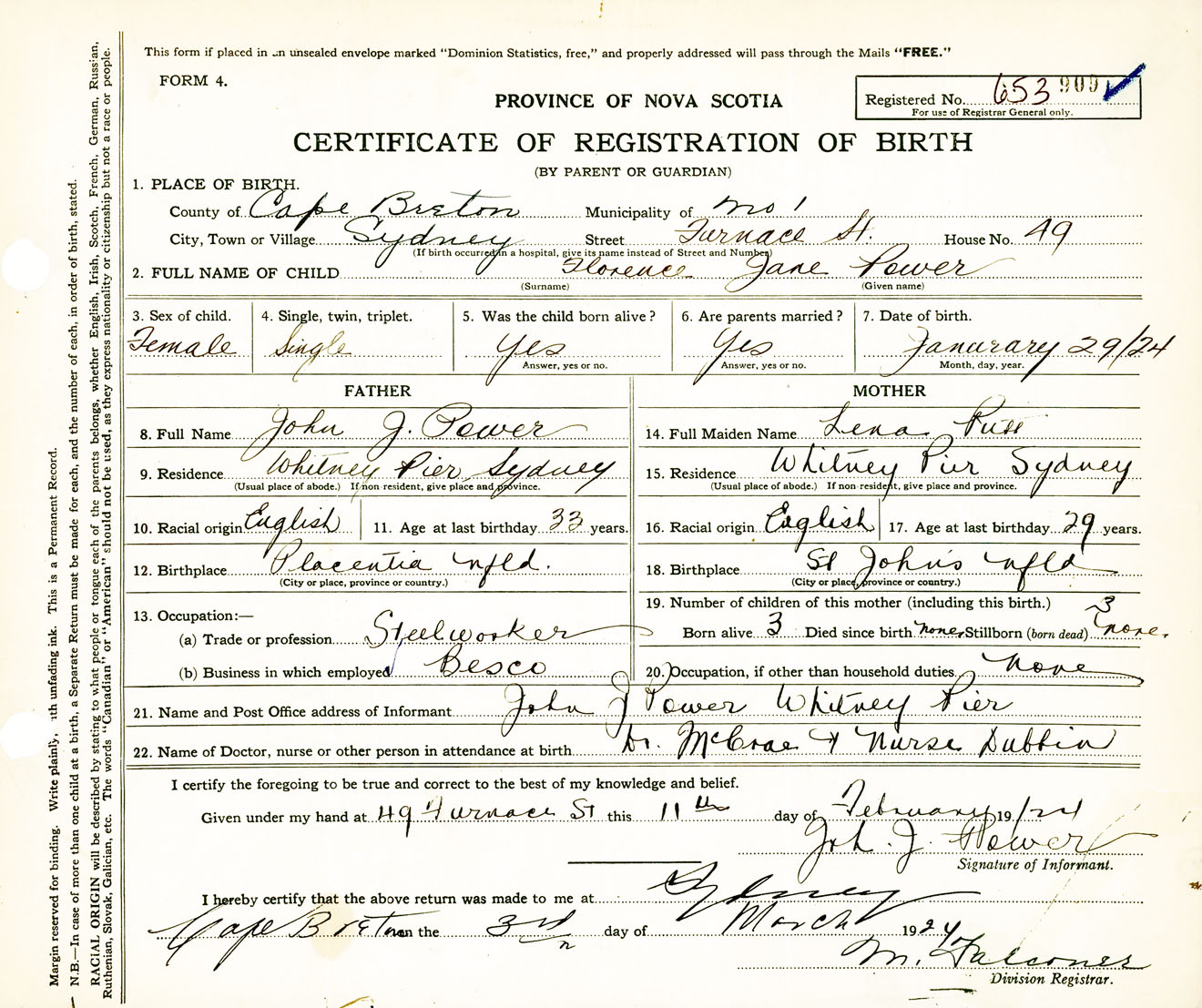 Female Birth Registration: Year: 1924 number: 65300909